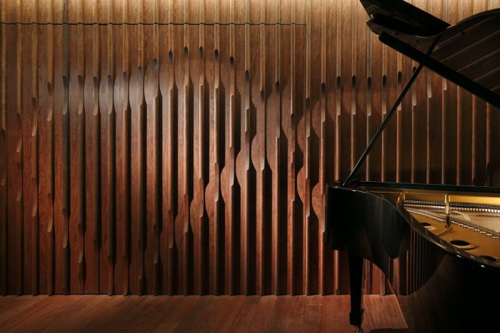 For the walls, bubinga and maple wood is used similarly to how Steinway uses it in pianos. To make the same effect as the concert hall’s echo board, the surface of the walls is uneven. For Tuning Room 1, rib structure, which is used in the Steinway pianos, is used on the wall.