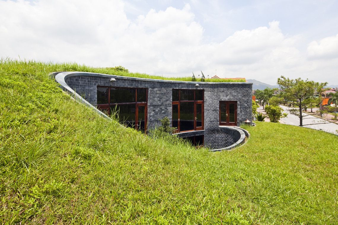 This torus-shaped stone house is located in a quiet residential quarter beside the way to Ha Long Bay from Hanoi. A rising green roof and walls composed of subdued color stones in dark blue create a landscape, which stands out in the new residential area.