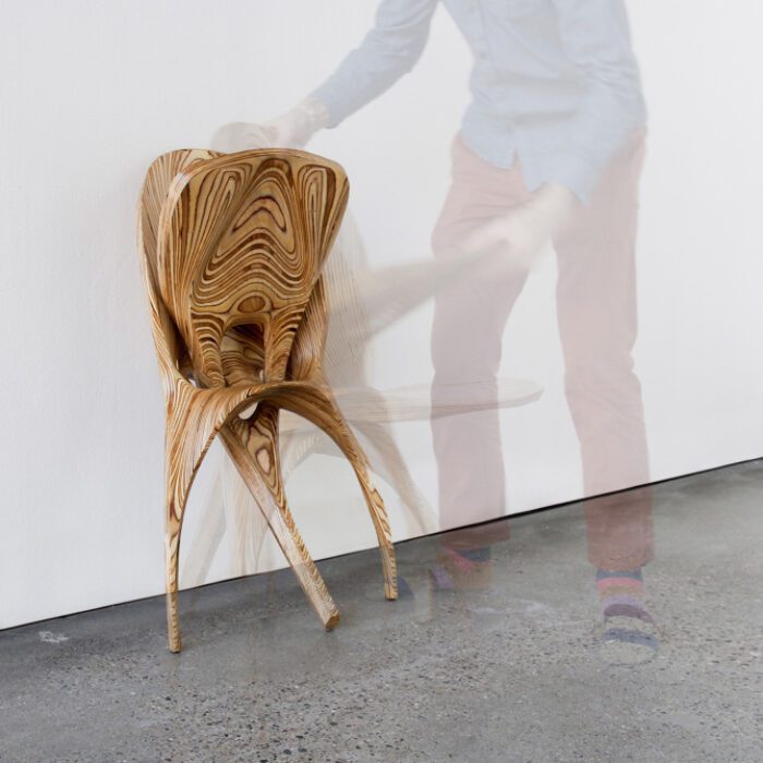 The result is a comfortable striped chair, that can be easily mistaken for a savanna inhabitant. The cutting technique and the complex geometrical form have made use of the layered material and have created an elegant curved design by emphasizing the contrast between them. “Its termination at the ground with three legs also accentuates the design’s edginess and give it a sense of delicate balance.”