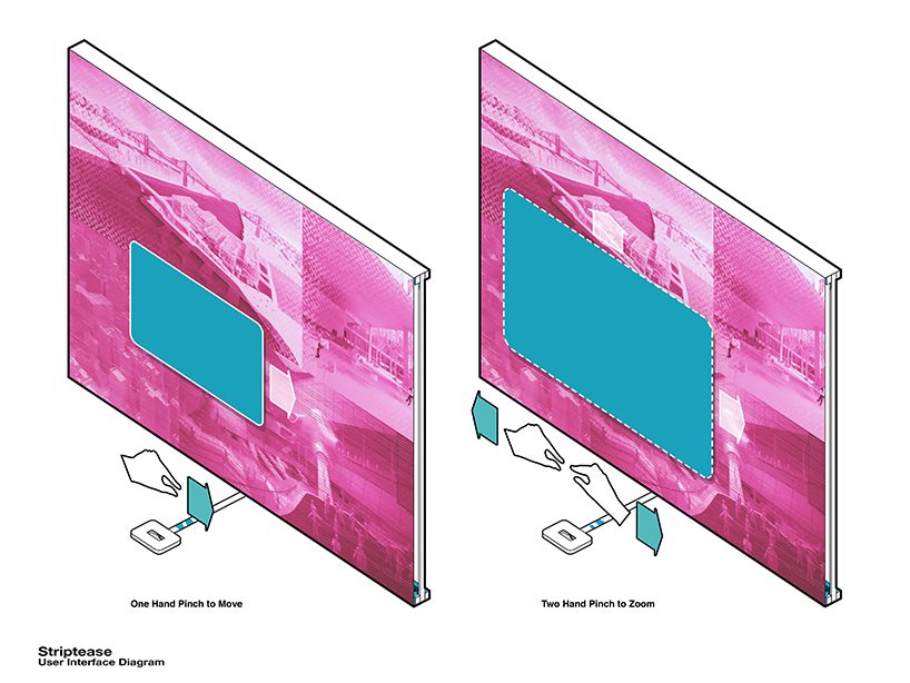 ” The concept of the exhibition is to allow the user to experience the ideas presented at his own time and pace, with as much details as he wants, at a desired speed. The students built a friendly user interface for Striptease, which allows the visitors to interact with the presentations, to scale, resize, zoom in or out, or ask for more content of a certain piece, if they are interested in it. You can simply “strip” a project of its “coat”, and look at it from any angle you want to.