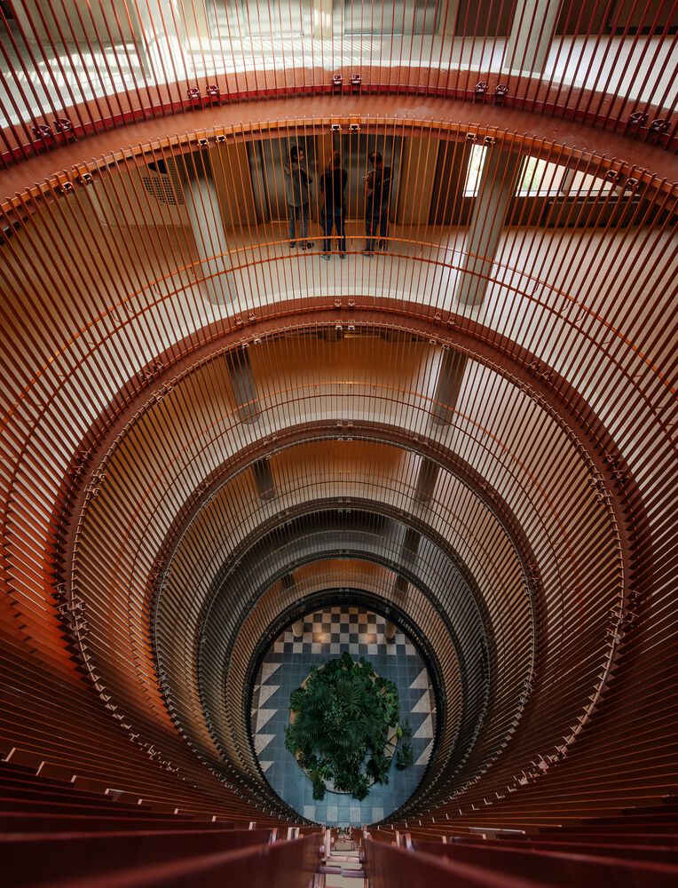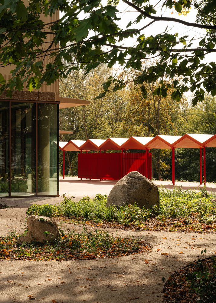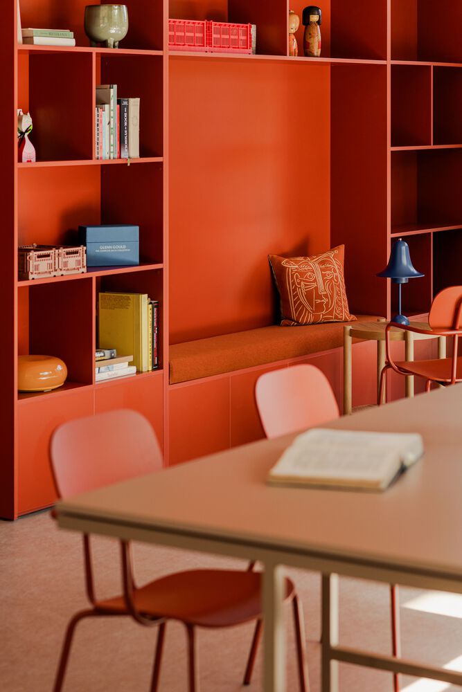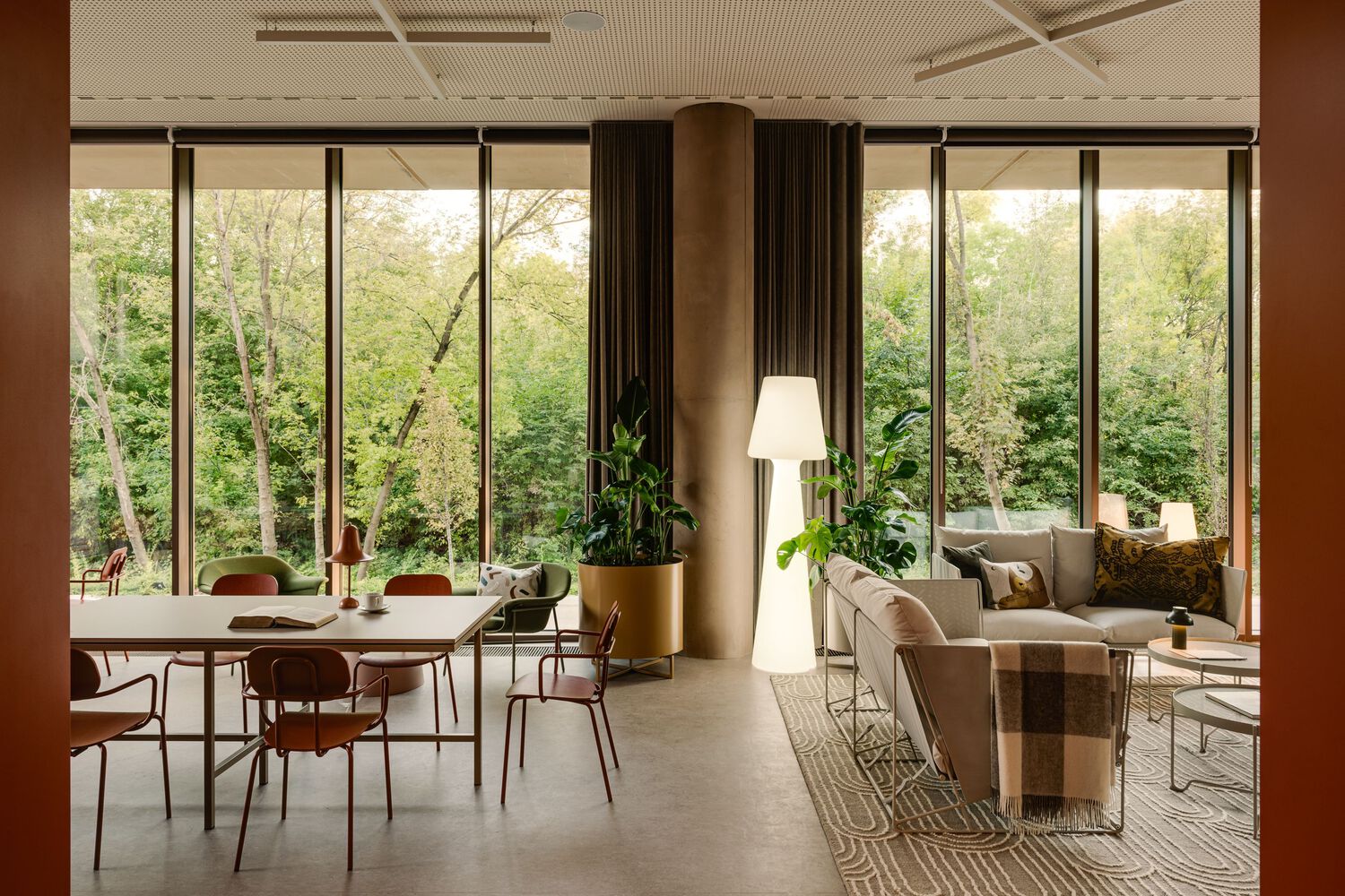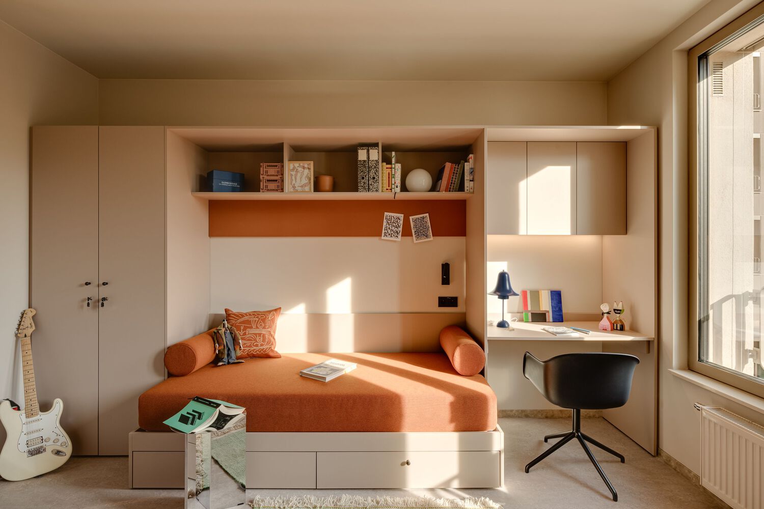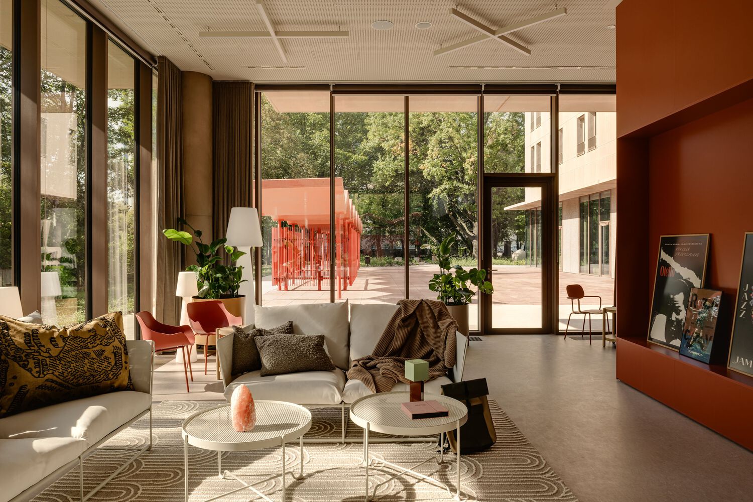 The interiors of Student Housing no. 7 strike a balance between simplicity and comfort, creating a space that feels just as natural for studying as it does for unwinding. A rust-orange color, used in furniture, railings, and architectural details, adds warmth to the clean, modern aesthetic, making the space feel both stylish and welcoming. Bright, open lounges with floor-to-ceiling windows overlook greenery, while cozy sofas, natural fabrics, and thoughtfully chosen decor make shared spaces feel more like a home than a typical dormitory. The industrial-style kitchens, featuring stainless steel countertops and bold orange shelving, invite students to cook, eat, and connect.