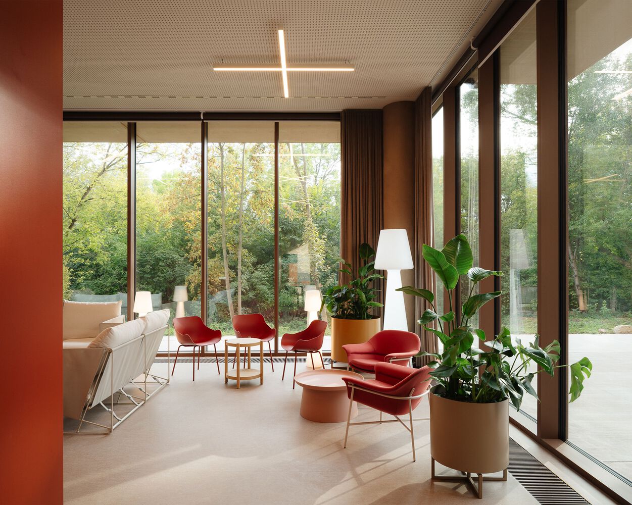 Built with energy efficiency in mind, the dormitory minimizes both environmental impact and operational costs. Windows in the hall area let in natural light, reducing the need for artificial illumination. Solar panels and a heat recovery system optimize energy use, while external blinds help regulate indoor temperatures. The landscape design preserves existing greenery and incorporates permeable surfaces, seamlessly blending the building into its natural surroundings.