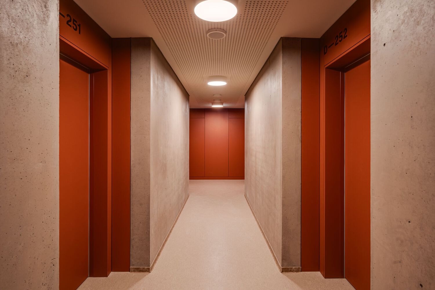 Covering nearly 10,300 m², the new dormitory features 138 residential units in a variety of layouts, primarily 2+2 and 1+1 double-room segments, alongside apartments for PhD students and professors. The building also includes 16 fully adapted rooms for students with disabilities.