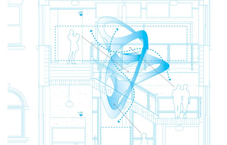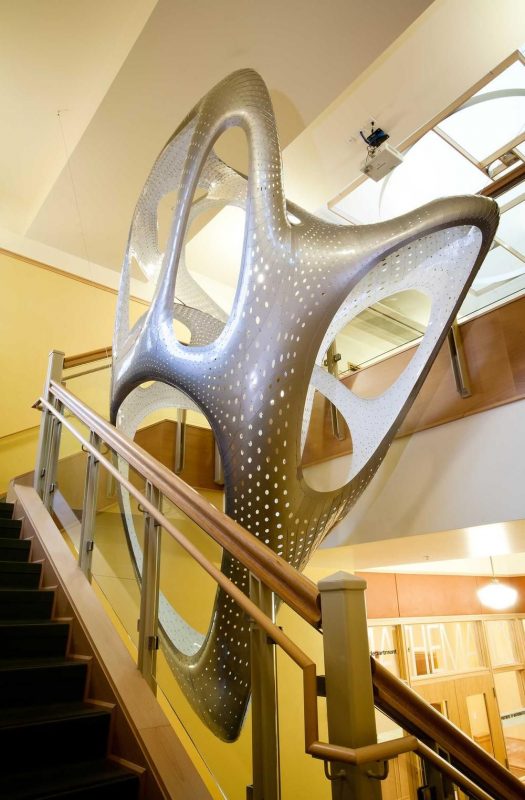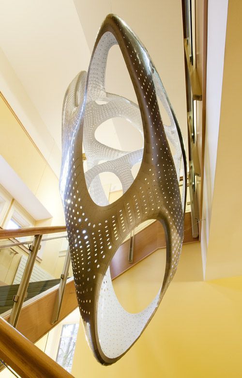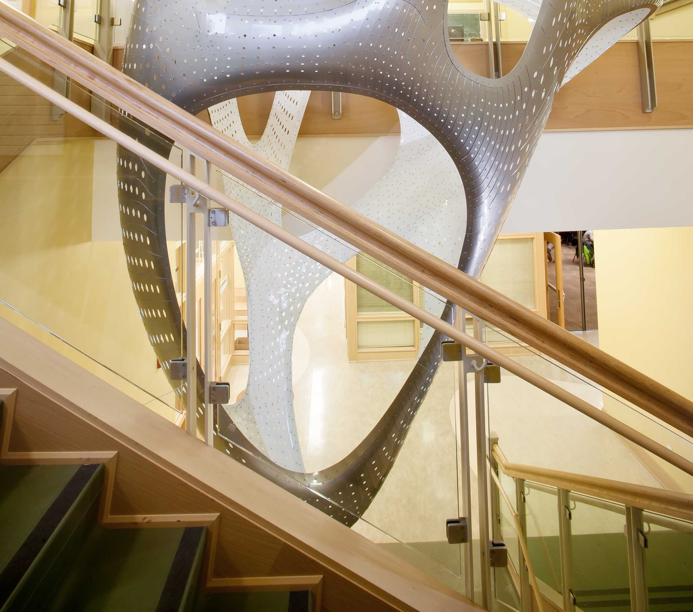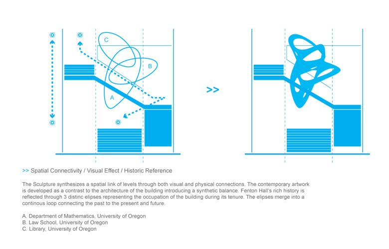 The installation contrasts the architecture of the Mathematics Department at Fenton Hall, University of Oregon, in which it hangs. Design: VA | DESIGN