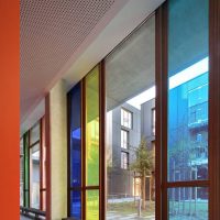 - Low-maintenance glass-enclosed galleries cover the entire complex. They additionally provide thermal and acoustic insulation to the building. As a result, the building requires less than 15 kW in an entire year to heat one square meter.