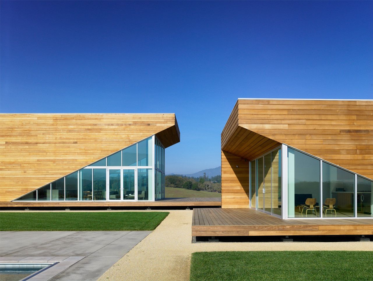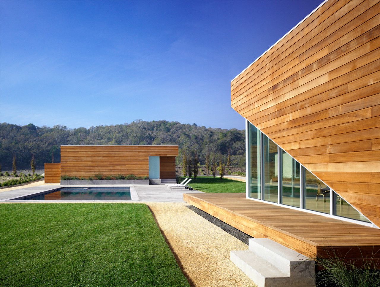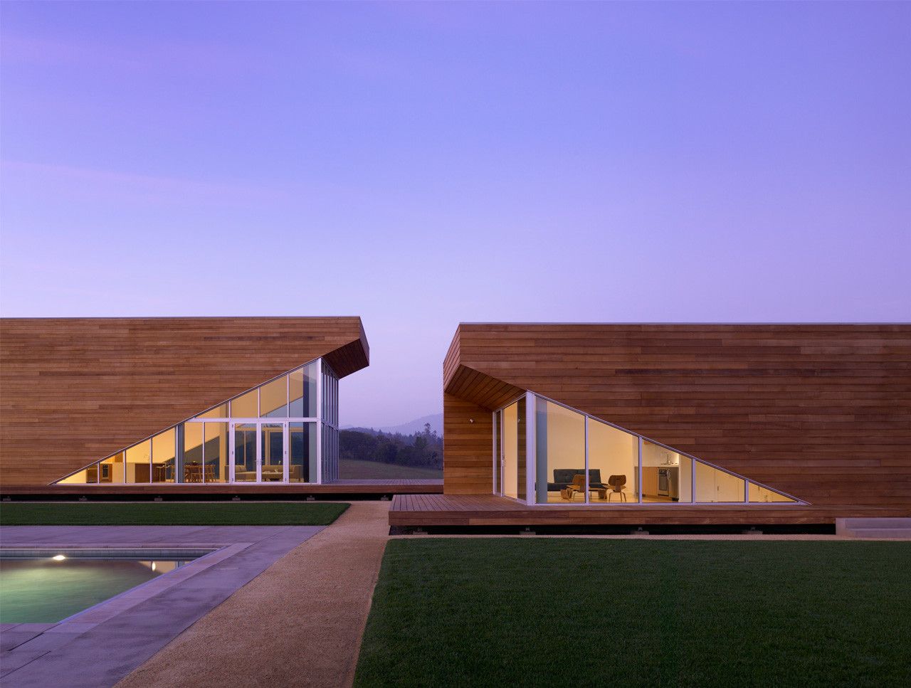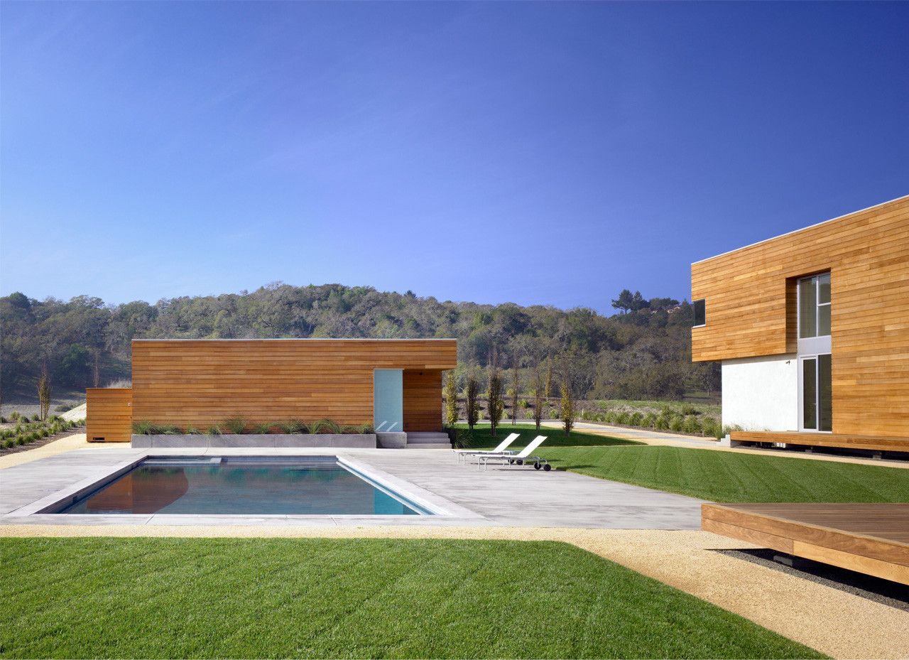 Edmonds + Lee Architects’ Summerhill Residence sits high in the hills of California wine country. Its distinct forms with raised corners mold an outdoor living area and courtyard.