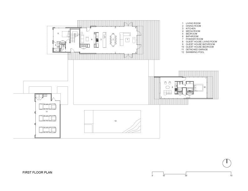 The residence consists of three separate structures, the main house, guest house, and a detached garage. The orientation of these buildings maximizes usable outdoor space and serves to connect natural and man-made elements.