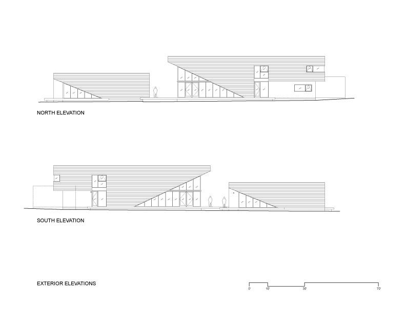 From the interior, snapshots of the horizon are mixed with the sloping lines on the interior, using natural and man-made geometries to play off of each other. A play between solid and void relating the buildings allows for privacy even within close vicinity.