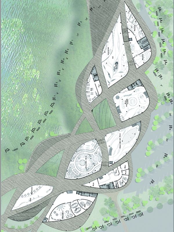 The Suncheon International Wetlands Center was designed with the intention to host visitors coming to admire the worlds fifth largest tidal flat while leading them through the wetlands to the Suncheon Bay. The receding tidewater imprints influenced the concept and fluid shape of the buildings and walkways. The circulation promotes the sense of wondering while providing a sensual picturesque experience for visitors, allowing them to see both the wetlands and the forest on the opposite side. Recesses were also introduced into the pathways in order for people to see how the wetlands extend underneath the structure supported by stilts. The waves and levels created in the landscape by the pathways and buildings enhance the natural change in topography from the wetland to the forest, providing an area where the two can meet.