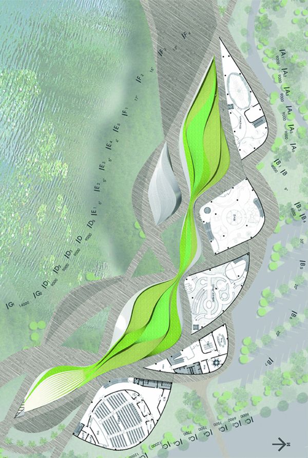Sustainable architectural practices are introduced into the different building functions by separating them and using different envelopes to maintain more control over the energy use. The design also plans for a green roof and a wooden façade intended to integrate the structure into the environment while utilizing passive strategies to minimize the amount of light entering the building in the summer and increasing winter lighting. In the end this building hopes to reconnect visitors to nature, but it makes me wonder if building on the wetlands is the best way to promote wetland preservation. Even though the structure is raised on stilts, there will still be shade casted on the ecosystem underneath of it and only time would tell what sort of impact it would make.