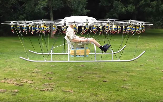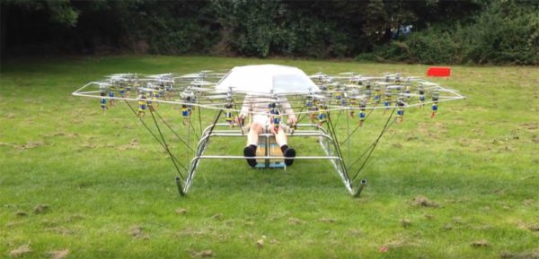 Introducing his own creation the creator comments: “The Swarm man carrying multi-rotor airborne flight testing montage. 54 counter-rotation propellers, six grouped control channels with KK2.15 stabilization. Take-off weight 148kg, max lift, approx. 164kg. Endurance 10 minutes. Power approx. 22KW.” Although the attempt is not a concrete milestone towards the goal of being able to provide a flying vehicle, it still represents the persistence of our race that does not believe in the theory of giving up.