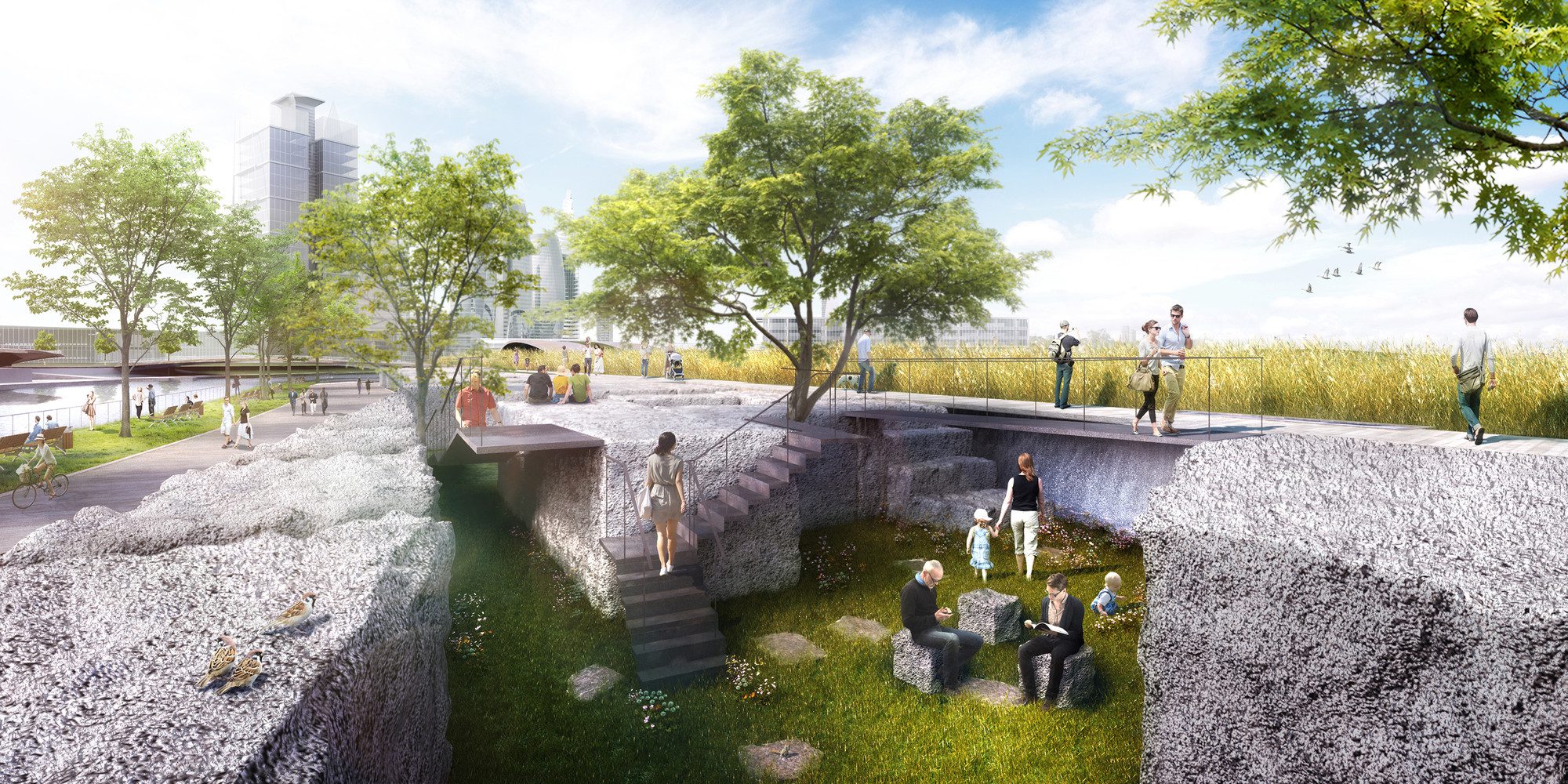A shallow square pond, miniature gardens, and an urban plaza and “Slope Stand” carve out open space for performances and social events. The urban core run alongs the waterfront and is composed of multiple levels featuring a beach, container, core room, plaza, and dock. These spaces house exhibitions, shops, cafes, an observatory, management center and pop-up stalls. Open air marketplaces attract artists and city-dwellers alike.