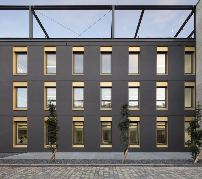 Along the outer perimeter are bright and quiet work spaces where the research work can be completed.The new building follows the urban planning principles for the campus. It is placed in line with the other buildings on the campus and its main façades are protected from excessive sunlight with a double facade. The sun-protection louvers on the façade are yellow anodized aluminium, the dark exterior walls are plastered solid brick, and the building frame is in-situ cast concrete.