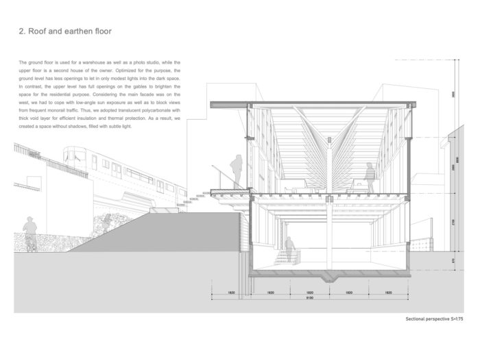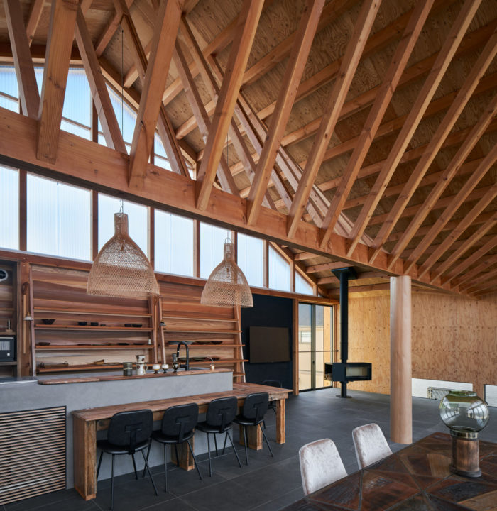 The timber frame structure consists of a lower structure with two-story posts and a roof structure with 90 by 90 mm timber struts. The timber struts support the purlins and shift in angles to form HP surfaces. The lower and roof structures, along with the floor frame in between, create a spacious single space on each level.