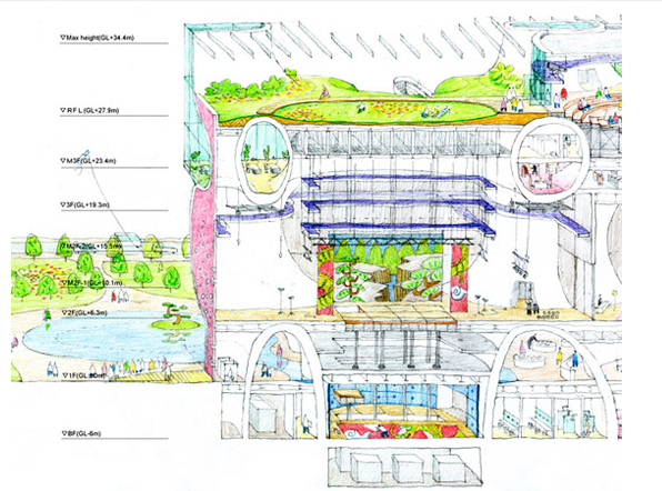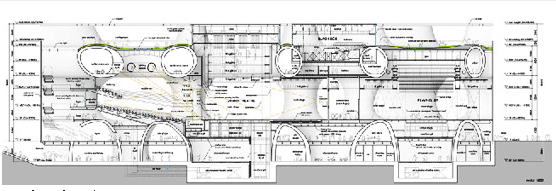 The method of construction for this building is an interesting one, worthy of note. Shotcrete, or sprayed concrete is the best, most efficient way to produced the forms present throughout the structure. Double-curved formwork would be difficult and expensive to build on-site. Thus, a temporary steel framework is assembled and fixed with expanded metal mesh. This mesh spans between the framework, giving the shotcrete something to adhere to and acting as a backstop. The thickness expected for the walls is 200mm at the top floor and 350mm at the bottom. A separate layer without aggregate is applied last to produce a smooth, finished surface.