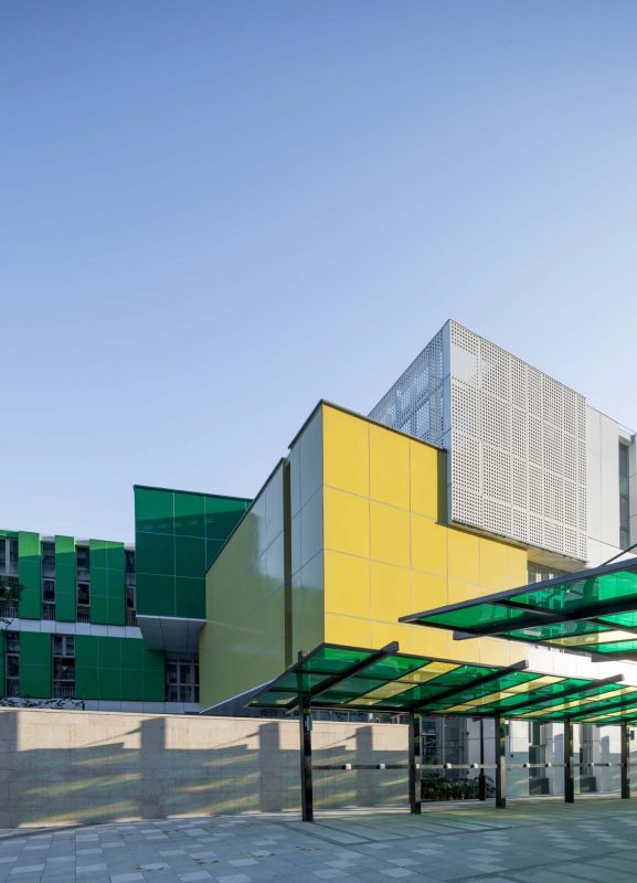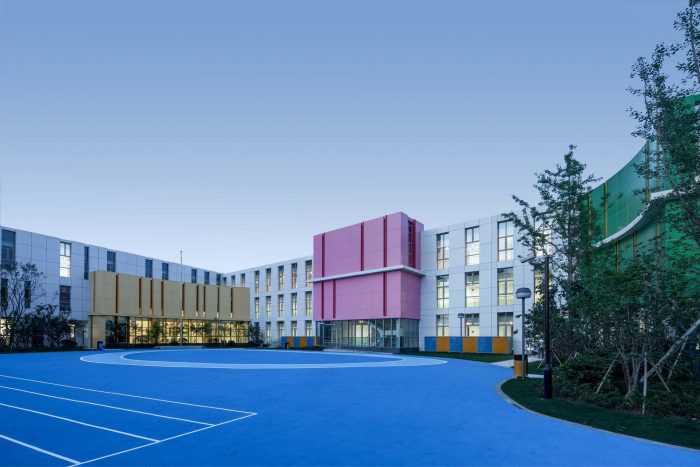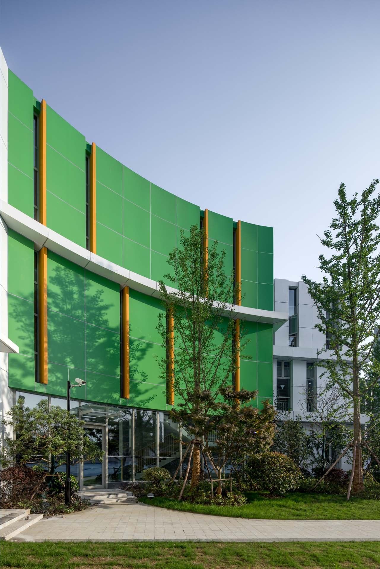 The exterior facade of kindergarten is aluminum alloy sheets exterior decoration. By precisely controlling the advance and retreat dimensions of aluminum alloy sheets and civil walls, architects have achieved rich level changes and detailed effects on the facades of the building. The interlacing of large and small shapes, the grooves and prominent lines reflecting the floor changes, the edges of windows, and so on, all show the architect’s delicate expression of materials.