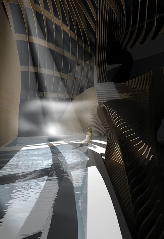 Taipei Herbal Baths, Linda Hagberg shared with us her design for ‘Taipei Herbal Baths’ investigates a new mode of responsive architecture based on the interaction between inherent material behavior and environmental variations. The hygroscopic capacity of wood, its reaction to the surrounding levels of humidity, is utilized to construct a climate responsive architecture. The project explores the relationships between the bather, releasing moisture to the environment, and the climate, causing fluctuations in relative humidity which, in turn, triggers the changes of material-innate movements of the responsive wood boundaries.