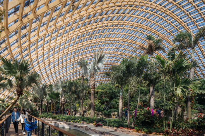 Crafting these magnificent structures required a combination of technical expertise in energy design, thermal performance, structural integrity, glazing, and logistics. The largest of the three domes, boasting a remarkable free span of over 90 meters, is a global marvel of timber lattice construction. All three domes comprise double-curved laminated timber beams arranged in intricate layers, complemented by double-curved glass panes, some of which are openable windows. The ingenious arrangement of the timber beams, resembling shells from above, enables optimized solar gain by creating varying translucency levels.