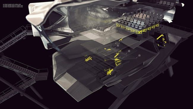 On the outer shell, Taiyuan theater tries to blend together different types of tectonics and geometry, which are reacting to different internal functions and exterior aesthetic needs. Such as surfaces with creased edge, boxy beveled volume and mellow, rounded bumps. The structural systems lifts the theater from the site, to free the ground, allowing the public to have an outdoor shelter space. Meanwhile, it creates this unique circulation sequence.