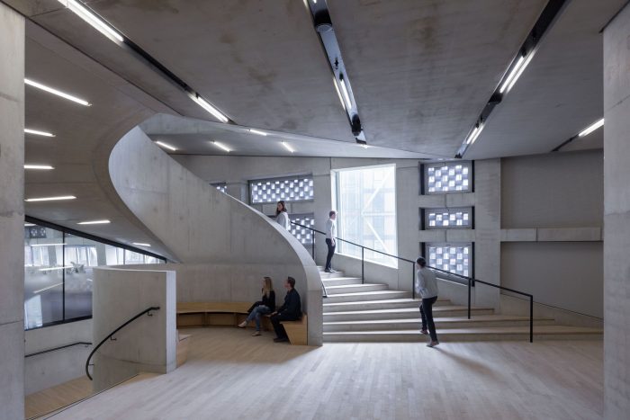 The Tate Modern Switch House is a beautiful manifestation of concrete cast as what can be called a modern take on a Pyramid; it seems to fold angularly, going out on an edge. Adding character to this volume is its texture formed by a perforated lattice of 336,000 bricks. What it doesn’t give away from the outside is that the lattice lets in filtered light during the day, and at night it lets light out, causing the structure to glow. Slit windows run along horizontal bands in the facade, breaking the lattice in places and framing views for people within. Emulating the windows on the Boiler House are thin vertical strip windows. “The resulting exterior creates both an iconic addition to the skyline and a unified Tate Modern. It also puts environmental sustainability at the heart of its design, with a high thermal mass, natural ventilation, solar panels and new green spaces. Two new public squares are being developed around the site, while the footprint of the Tanks is echoed in a large terrace opening out from the new southern entrance.”