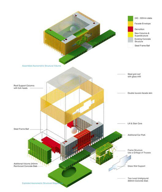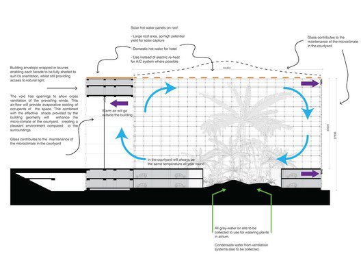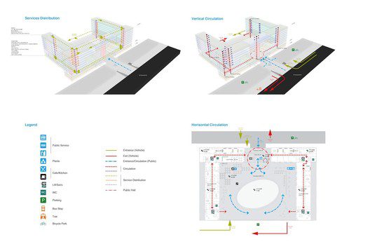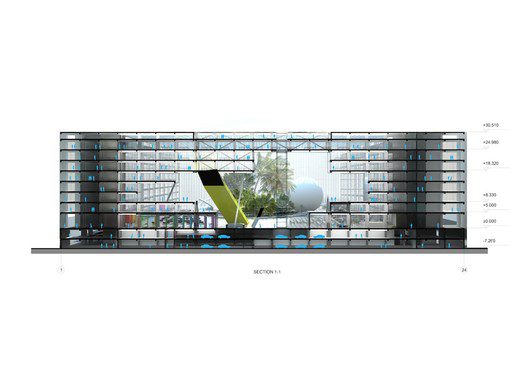 Program of the building is focused two main features – the void and the Oasis courtyard. The void combines functions of a lobby, reception, operation hall and smoking terraces. It acts as a buffer zone before the covered courtyard. Shuttle lifts are connecting the lobby to the senior management offices floor and the sky-garden. Recessed glass wall allows terraces to be used as staff smoking and recreational areas. The courtyard connects all three main volumes of the building on the ground floor and acts as an extended lobby. The covered courtyard has annual subtropical temperature for the orangery which is the main feature of the courtyard. Translucent sphere is a fifty seat conference hall with a gallery spiral space above it. The entrance to the sphere is a bridge though the orangery. The interaction of the program and the stage of the proposed building emerged based on a number of considerations: Primarily, the desire to create a greater lobby and a multipurpose place for the people to create business.