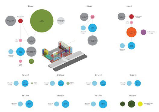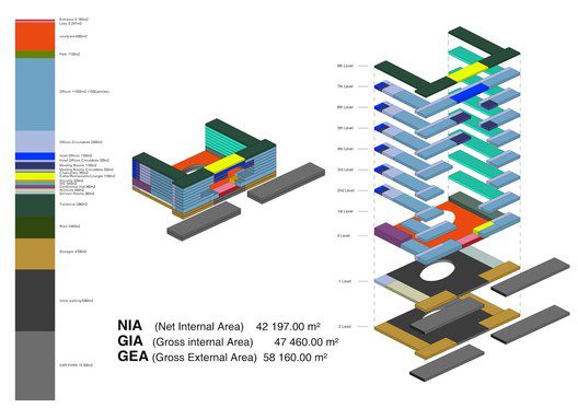 The project relies on ten plus two underground floors of building program in order to maximize the use of land and budget. The building has a sky-garden with a direct access from the lobby. The car park has separate access points from the front and the rear parts of the building thus offering each member of staff park at its closest offices block. The senior management team has a separate entrance and car park with a direct access to it’ own office floor.