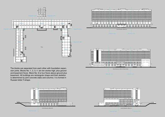 The existing building complex was built in the 70th century. The complex consists of several buildings blocks. The blocks are separated from each other with foundation expansion joints. Blocks No: 1, 2, 3, 4 are ten stories high, plus ground and basement floors. Block No: 6 is four floors above-ground plus basement. All buildings are rectangular shape and their skeleton is determined by joint concrete slabs and columns. It is formed in Russian letter П-shape.