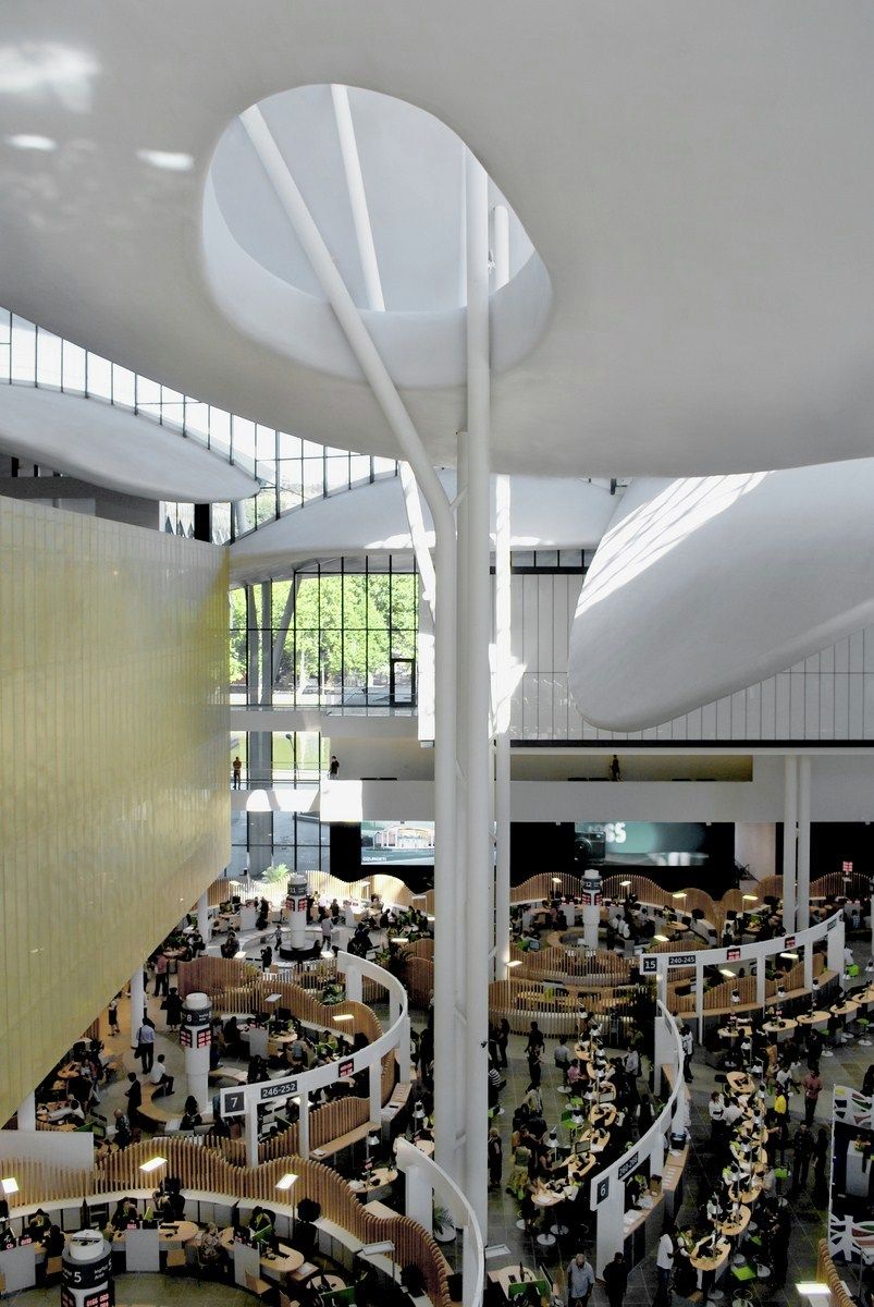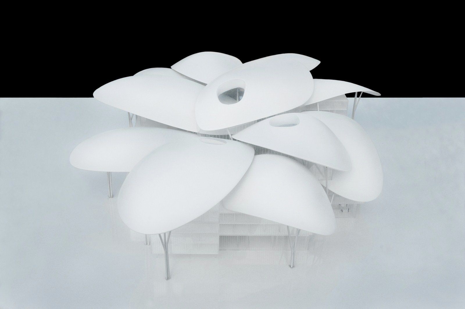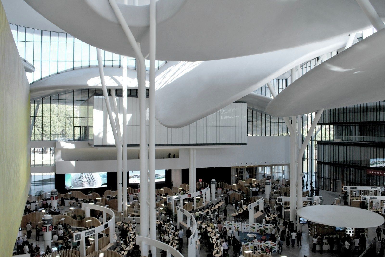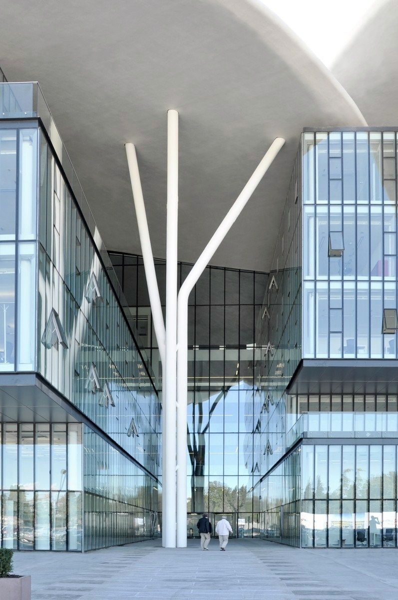 Volumes and the central public space are towered above by 11 big “petals” that are independent both formally and structurally from the rest of the building. Three of those big petals covers the central space. The petals, different for their geometry and dimension, reaches almost 35 meters and they are supported by a structure of steel pillars with a tree shape, visible, as well as the petals, externally and internally from the building.