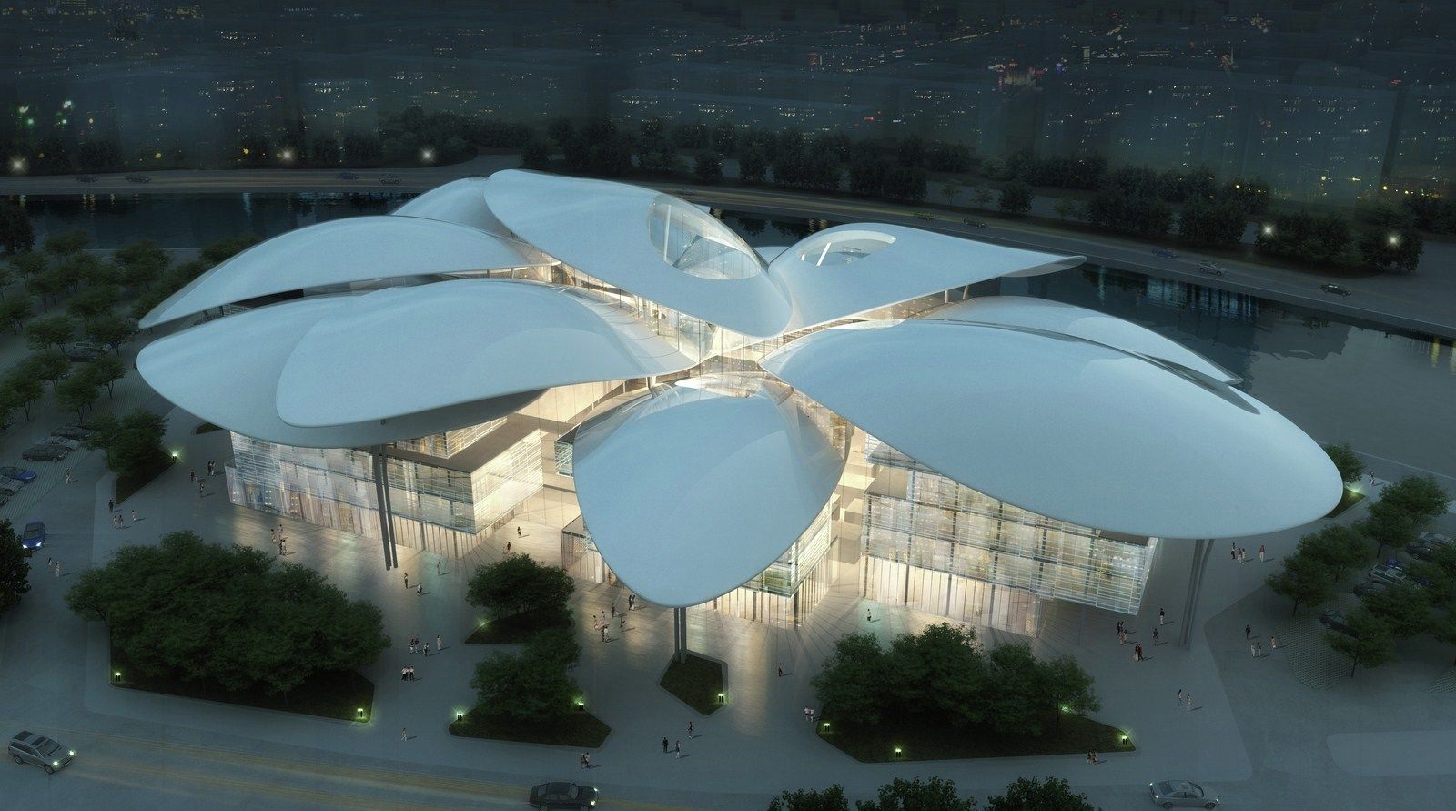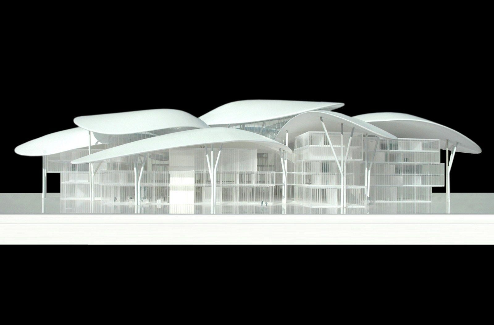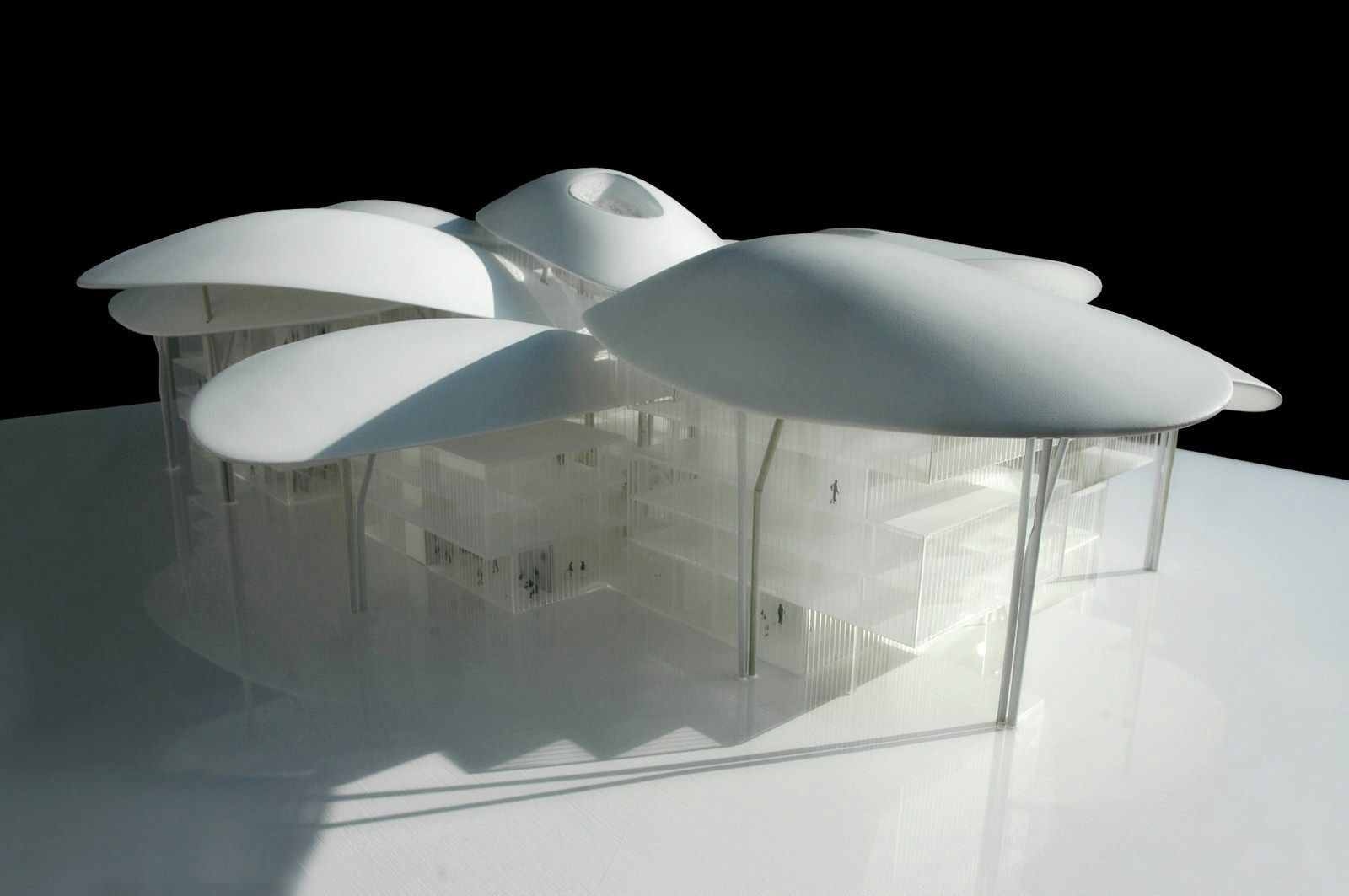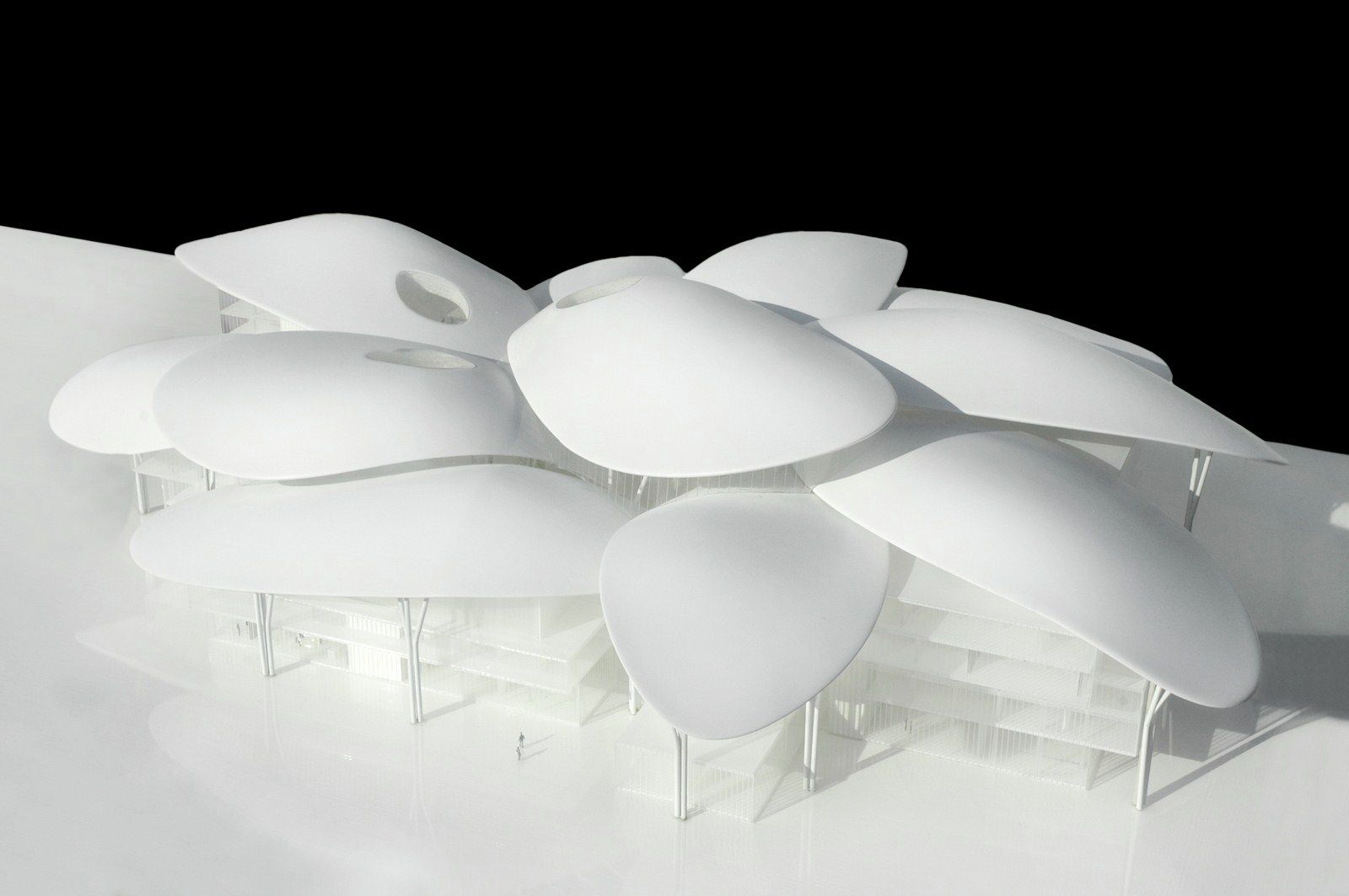 Volumes and the central public space are towered above by 11 big “petals” that are independent both formally and structurally from the rest of the building. Three of those big petals covers the central space. The petals, different for their geometry and dimension, reaches almost 35 meters and they are supported by a structure of steel pillars with a tree shape, visible, as well as the petals, externally and internally from the building.
