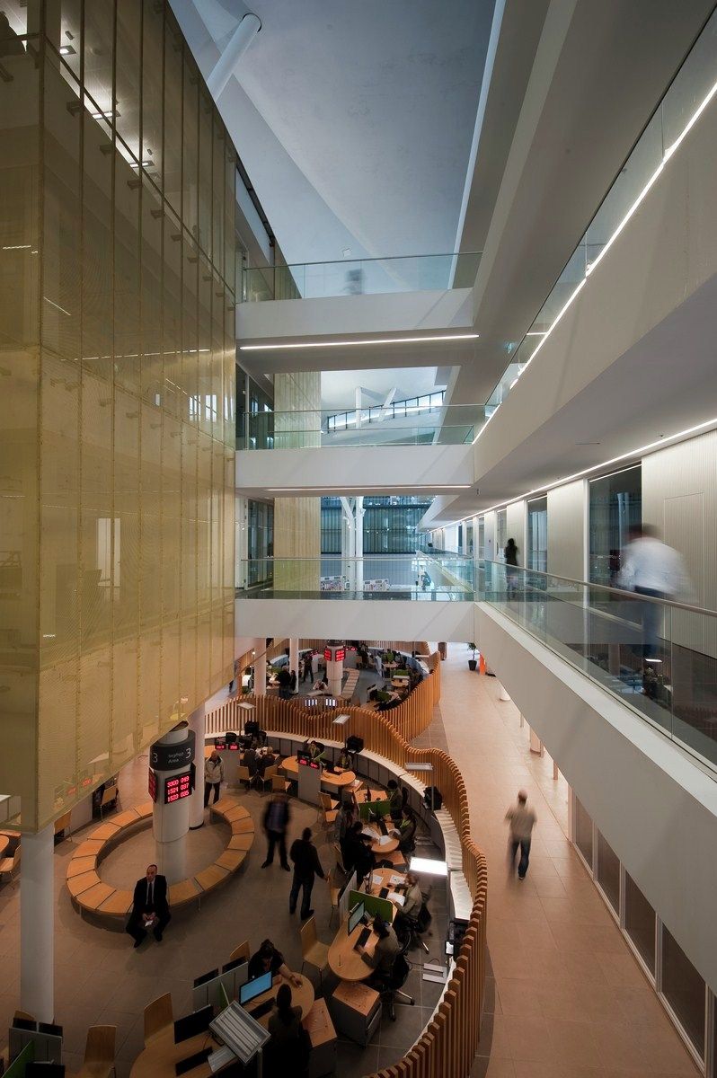 The building is made up of 7 volumes that contain offices (each volume is made up of 4 floors located on different levels). These volumes are placed around a “central public square”, which is the core of the project, where there is the front office services. Offices are connected to each other by internal footbridges that stretches on different levels.