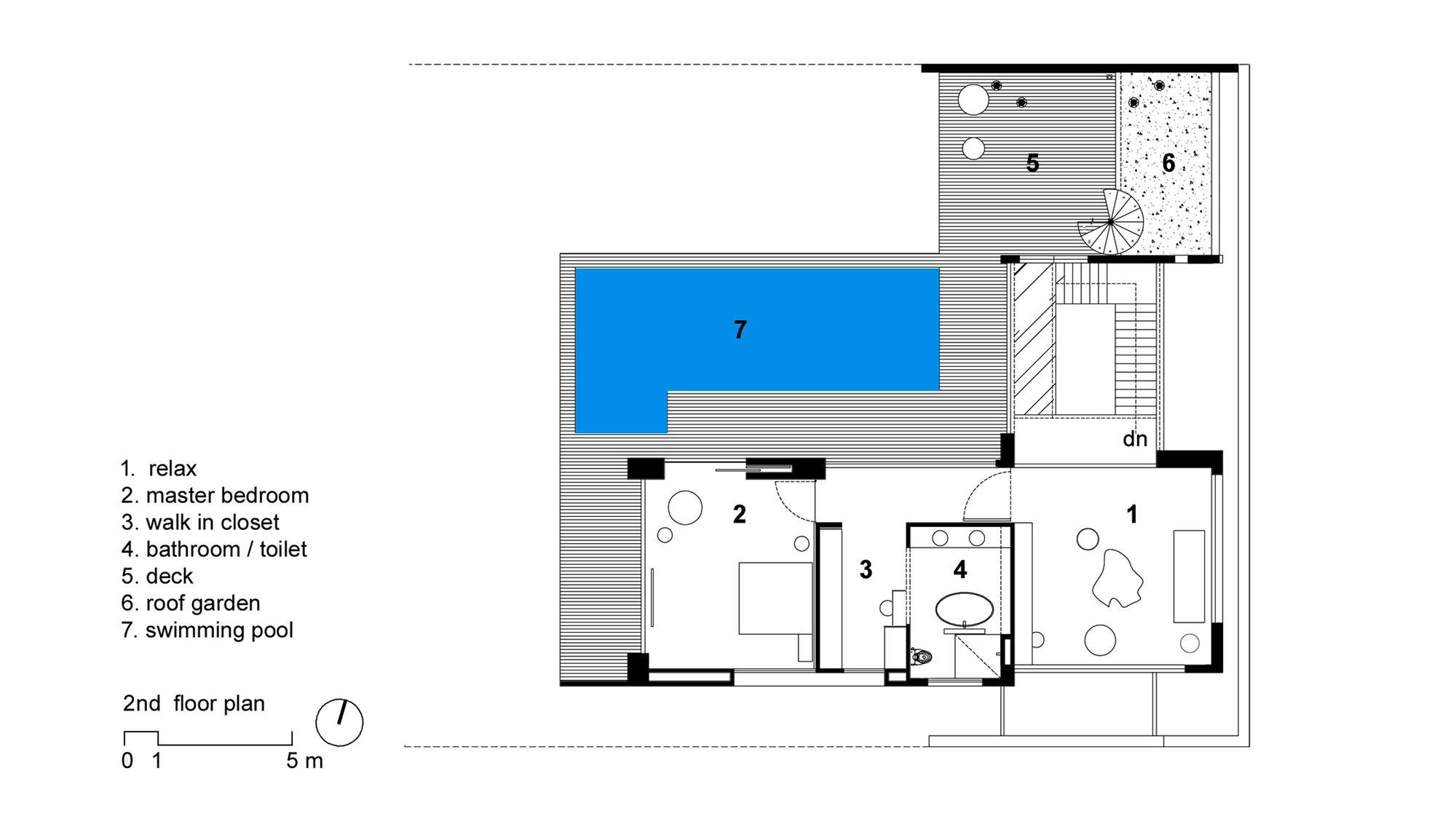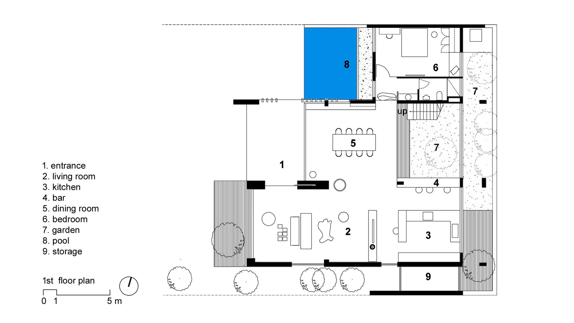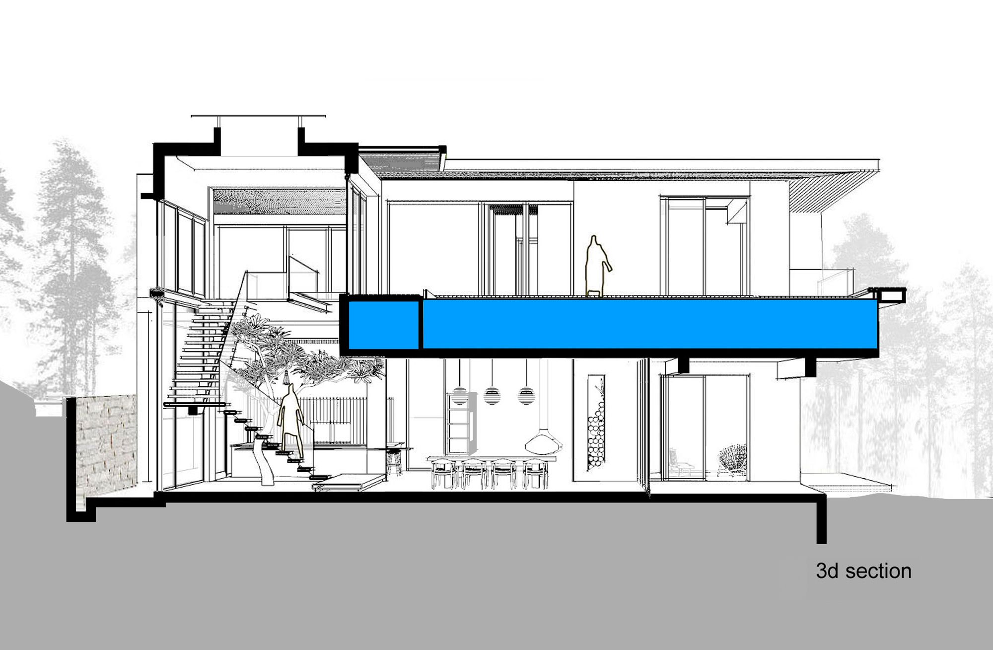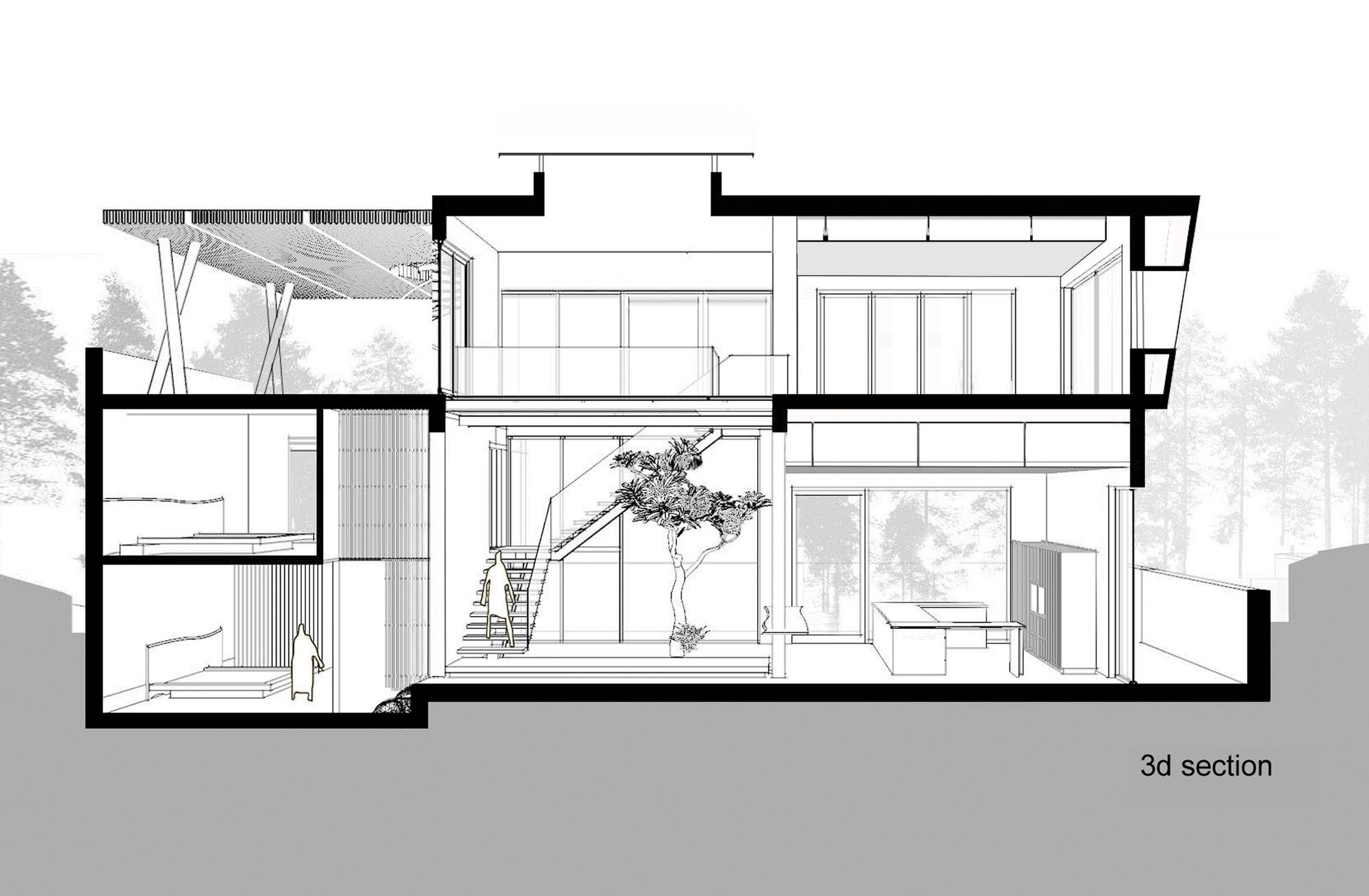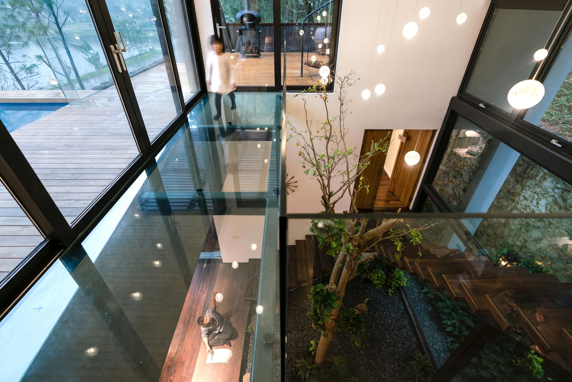 The ground floor features a living room, kitchen, dining room facing the front yard and the back garden, and a small bedroom in the mezzanine floor. At the landing of the stairs is the entrance to the mezzanine bedroom. Continue to move through the wood stair above the garden with soils and trees, we will meet the living room adjacent to the main bedroom on the first floor. On the duplex space, there is a glass floor connecting to the swimming pool and the garden. This pool-garden is the main feature landscape to arrange function rooms around.