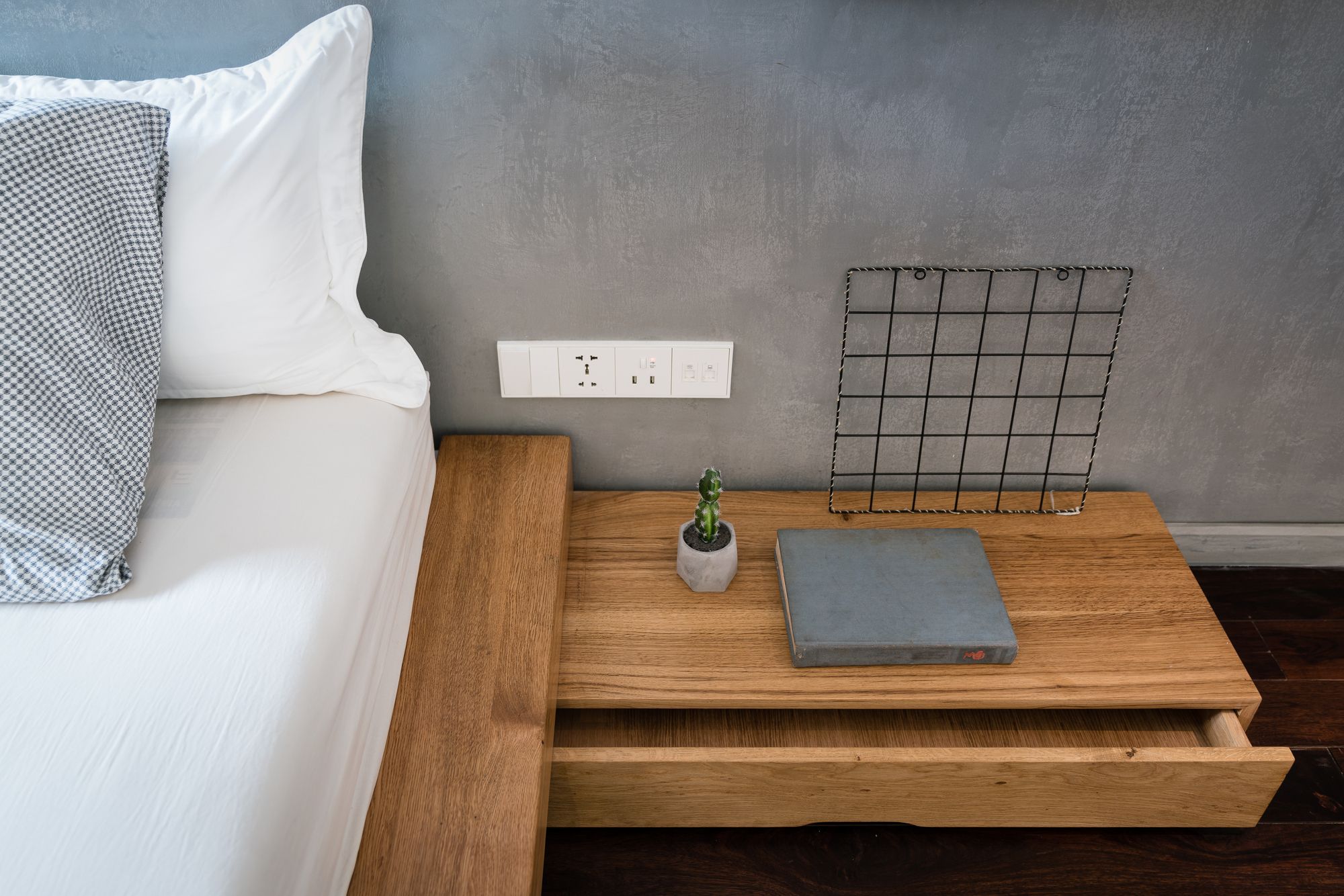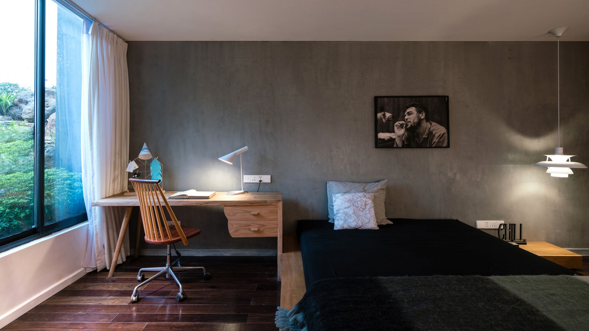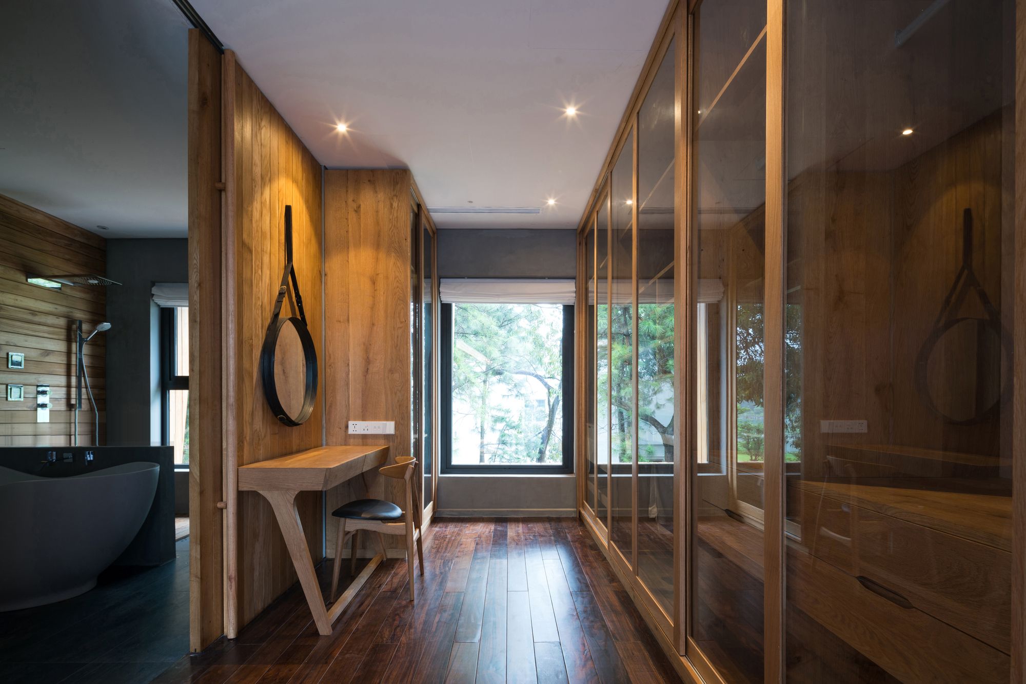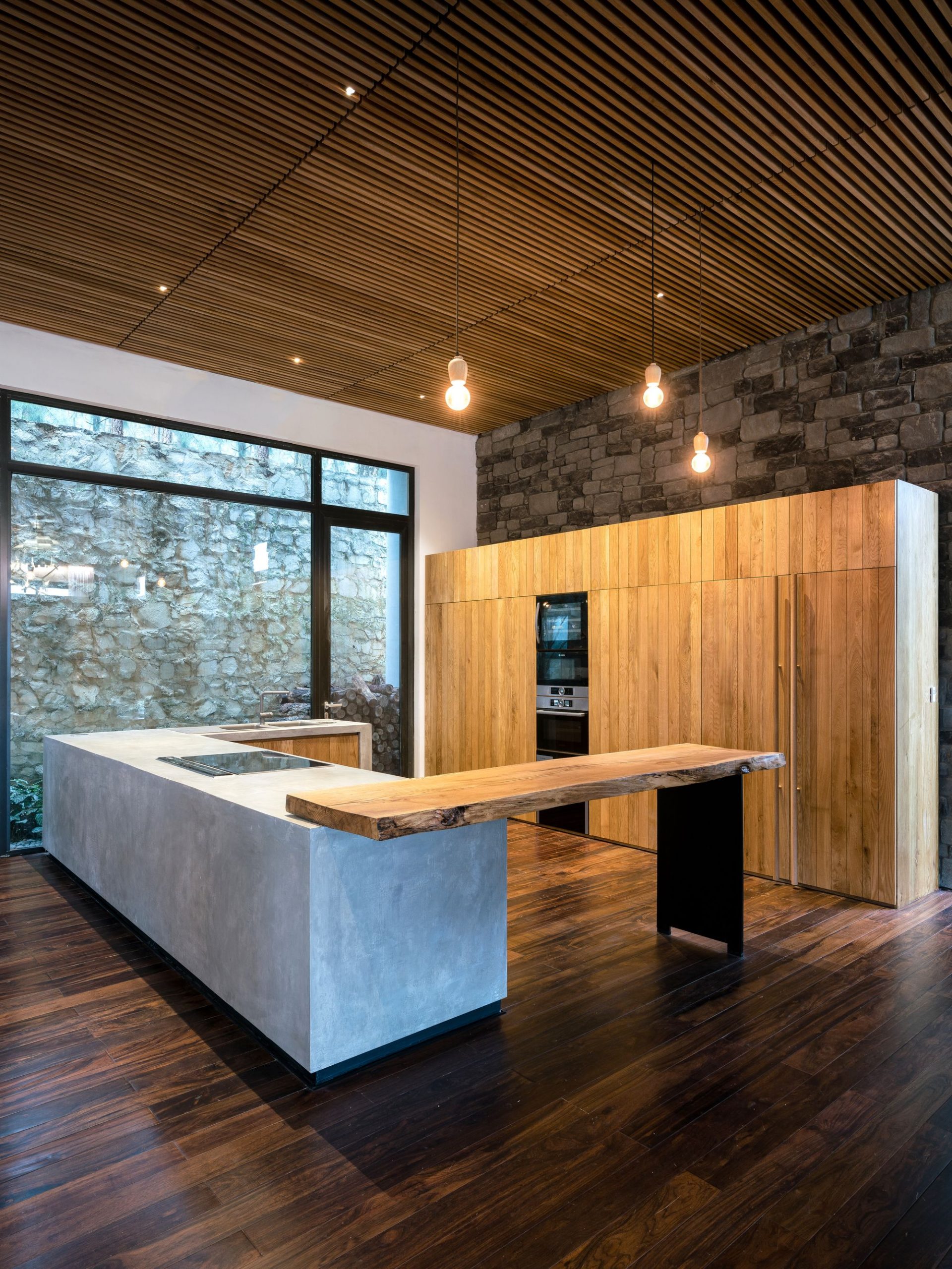 The facade is cladded with a layer of Teak wood combined with rough stone. The entrance to the lobby area is natural stone steps that rise above the grass. Natural wood wiping the oil and exquisite furniture in the Nordic style make the simple design of the living room. The highlight of the room is a white oiled cupboard, suspended in the Φ320 steel tube with the function of reversing the living, cooking and eating space.