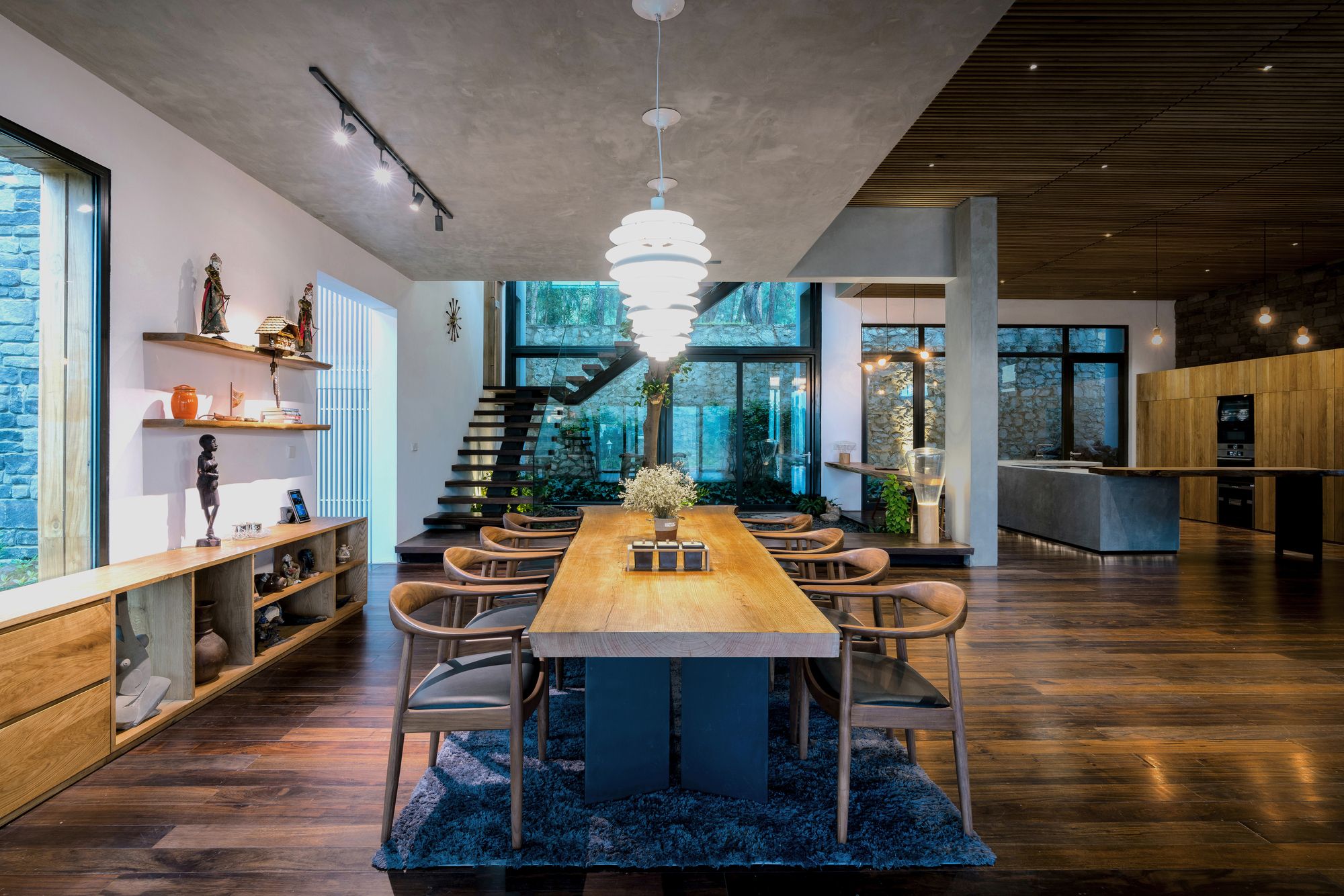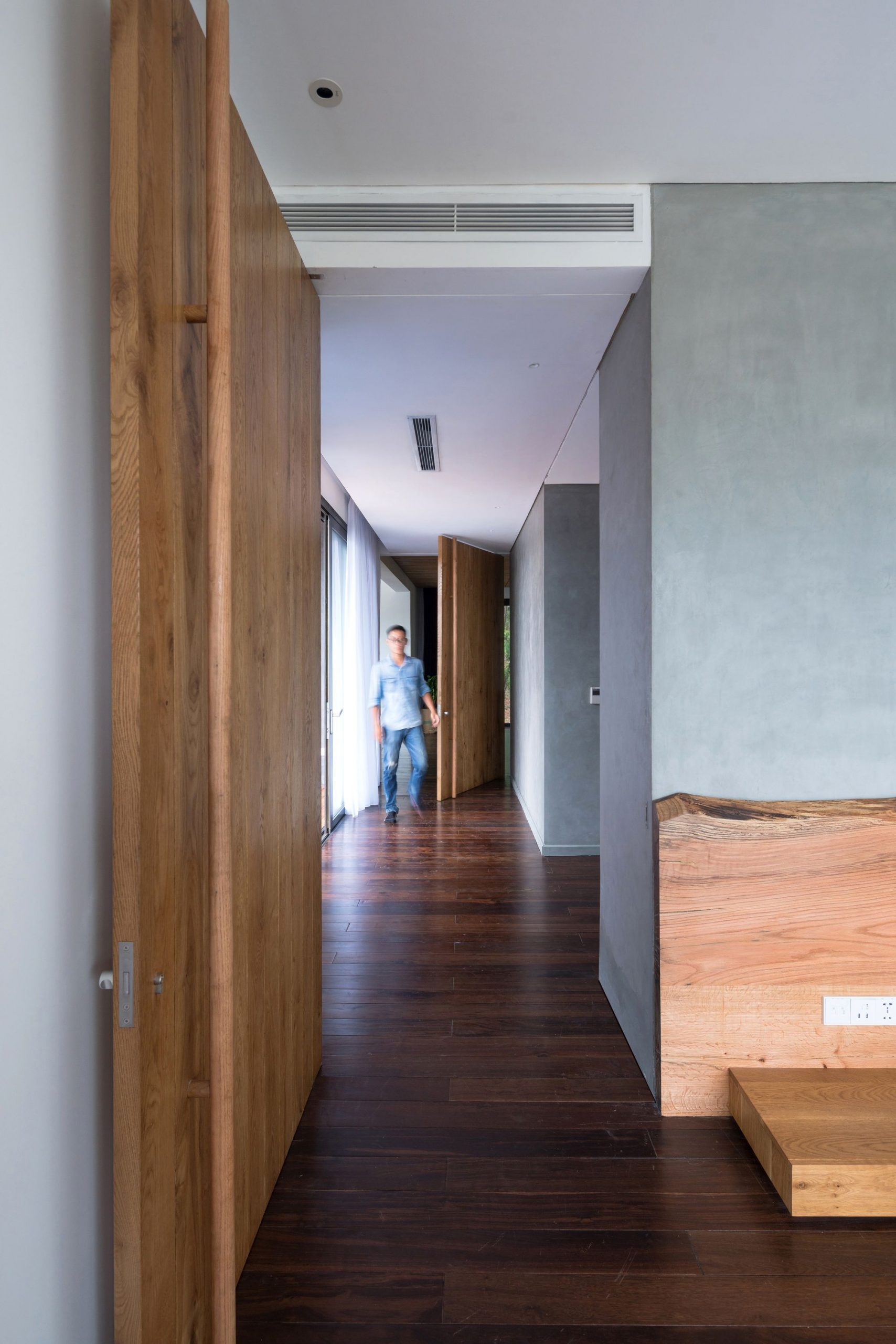 In this house, you will always feel the breeze blowing slowly from nowhere as the architect has put in an interesting effect that the entire ceiling fan system is hidden on the wood ceiling. Other technical systems (air conditioner, sound, fire protection, lighting, etc.) are also hidden in the ceiling to “clean” the interior.