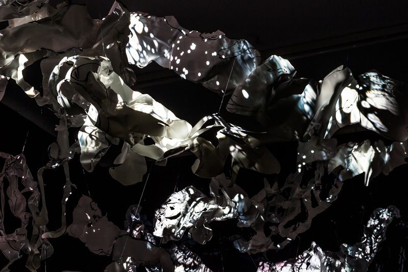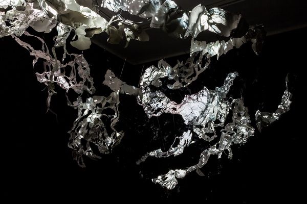 “Tearing Shadows” is a multi-media installation by German based artist Robert Seidel. The installation is composed of suspended molded plastic, and using projected imagery to continually alter the presence of his physically constructed sculpture. The combination between the sculptural form and the video sequence unfolds the shadow and gives it an autonomous existence.  401contemporary, the gallery in Berlin where Seidel’s installation was exhibited, describes the installation as the following  “As autonomous existences light and shadow compete on the surface of the projection sculptures and, driven by eternal change, create endlessly varied transitional spaces.”