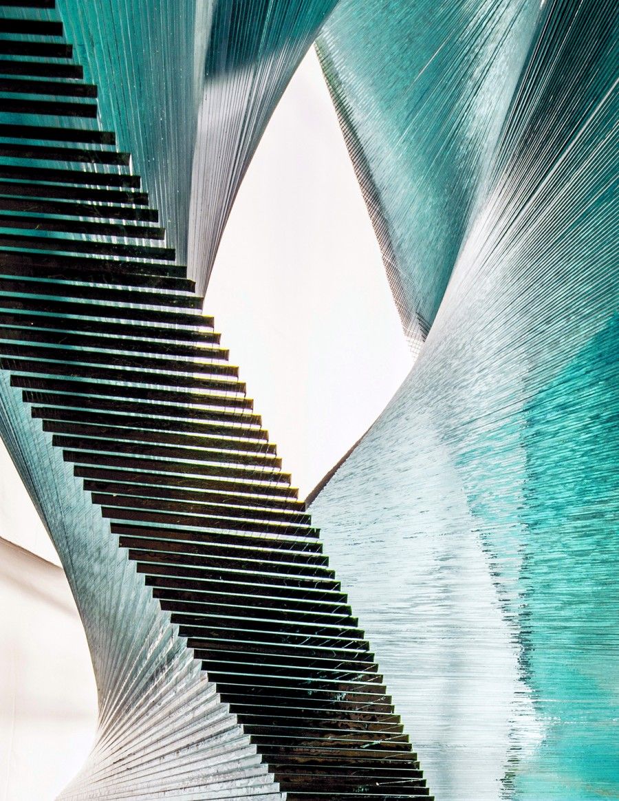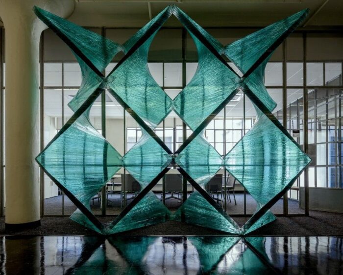 “Tectonics of Transparency” is a glass undulating architectural structure installation created by Cristina Parreño Alonso. It is currently installed at the International Design Center at MIT in Boston, MA.