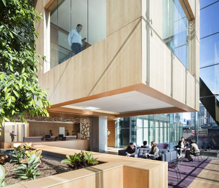 Inserted into this double height four storey space, floating “skybox meeting rooms,” an architectural first in Vancouver, increase programming capacity, link and animate every floor, merge the public and private realms and give users a memorable connection to the city. These oat over raised gardens planted with live trees and shrubs – recalling many offices of the post-modern period, but not in vogue for many years.