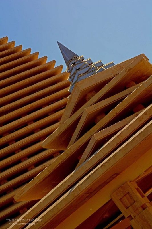 The state of Rajasthan has known the world over as the source of stone and stone craftsmanship. We sought to celebrate this heritage. The local Jaisalmer Yellow Sandstone was our choice of stone – its glowing surface reflects that golden desert sun that is strongly associated with Rajasthan. The yellow sandstone gives the temple an appearance of having risen from the surrounding sands. The pure compression structure is revealed through each course and component that forms the superstructure. The design – with its strong form, stark quality and play of light on warm stone – seeks to evoke visual and tactile senses of the worshiper. The stainless steel ‘shikhara’ or the peak atop the golden stone, catch the light during sunrise and sunset and also celebrates the legacy of the organization that commissioned this building. At different times of the day, from different directions, the temple is heavy and light, solid and translucent, valid and void, past and present.
