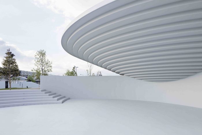 The construction technique used to create the plaza’s round cofun structures consisted of fitting together pieces of a precast concrete mold resembling a huge pizza. Because precast concrete molds are formed at the factory and then assembled onsite, the resulting structures are precise and the same mould can be used multiple times, ensuring excellent cost-performance. The pre-formed parts are pieced together like building blocks using the same massive cranes used to build bridges. Large spaces can be formed without the use of columns or beams, and because of the round shape, the well-balanced structures offer stability against forces applied from any direction.