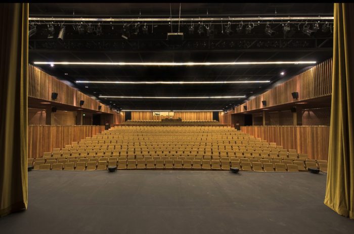 The horizontal platform surrounding the triangular building serves as a viewing area for the archeological zone and towards the city. This grand plinth contains a series of patios, one of which, facing the secondary entrance to the auditorium,has been sunk into the ground to create a small open-air theater space. This platform generatesa variety of exterior spaces and resolves the secondary access to the interior of the auditorium or to the platform itself, while incorporating the existing large trees.