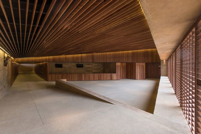 The main lobby is a semi-open space with strategically located apertures permitting cross-ventilation, avoiding the use of electrical air conditioning systems. The axis of composition of the triangular floor plan of the entrance space was deliberately aligned with the main pyramid. As a result, the lobby placed exactly opposite the pyramid becomes a viewpoint and a space for meeting before or after events, and a space that establishes an ongoing dialogue with contemporary cultural life and the presence of the past.