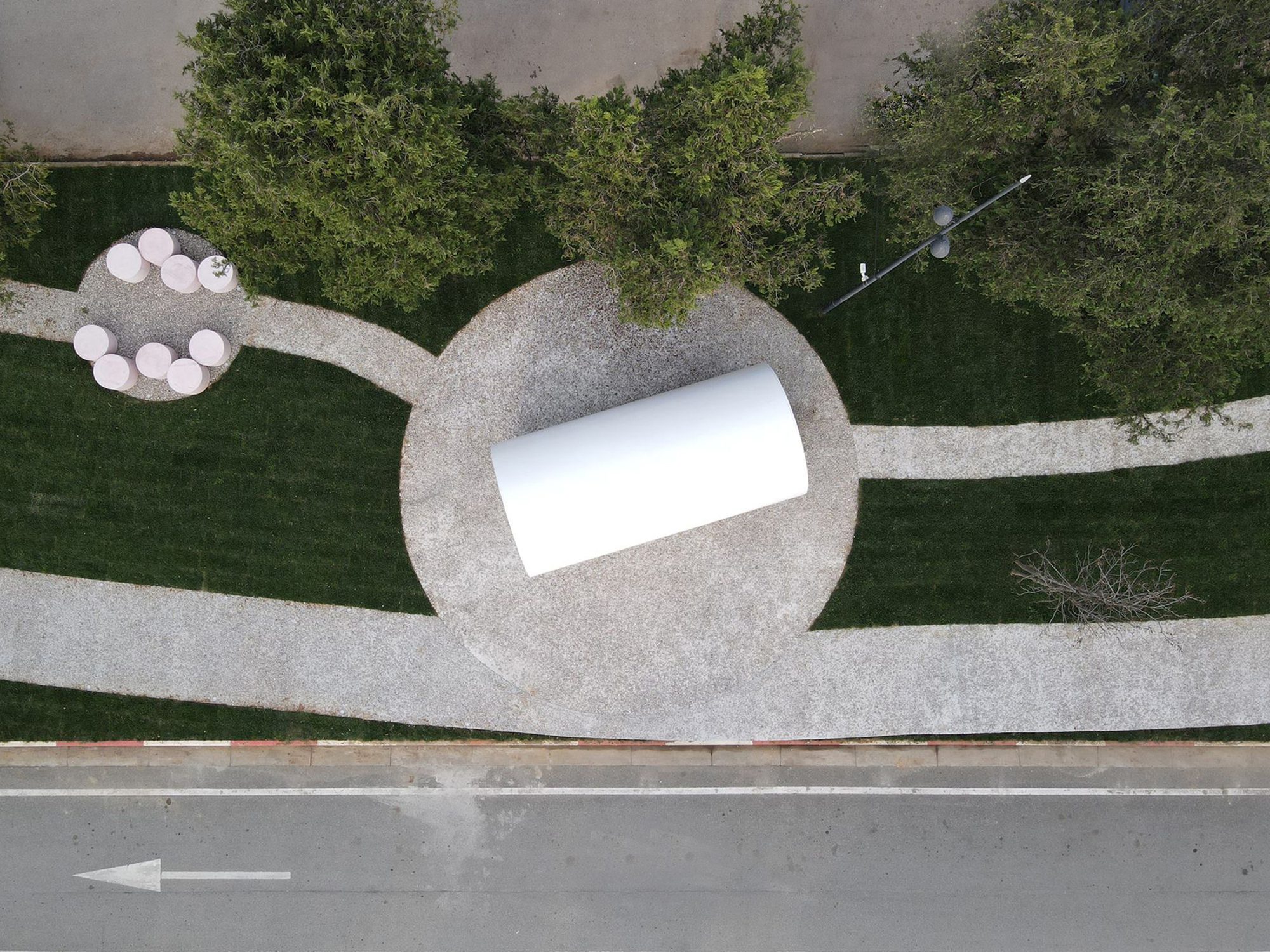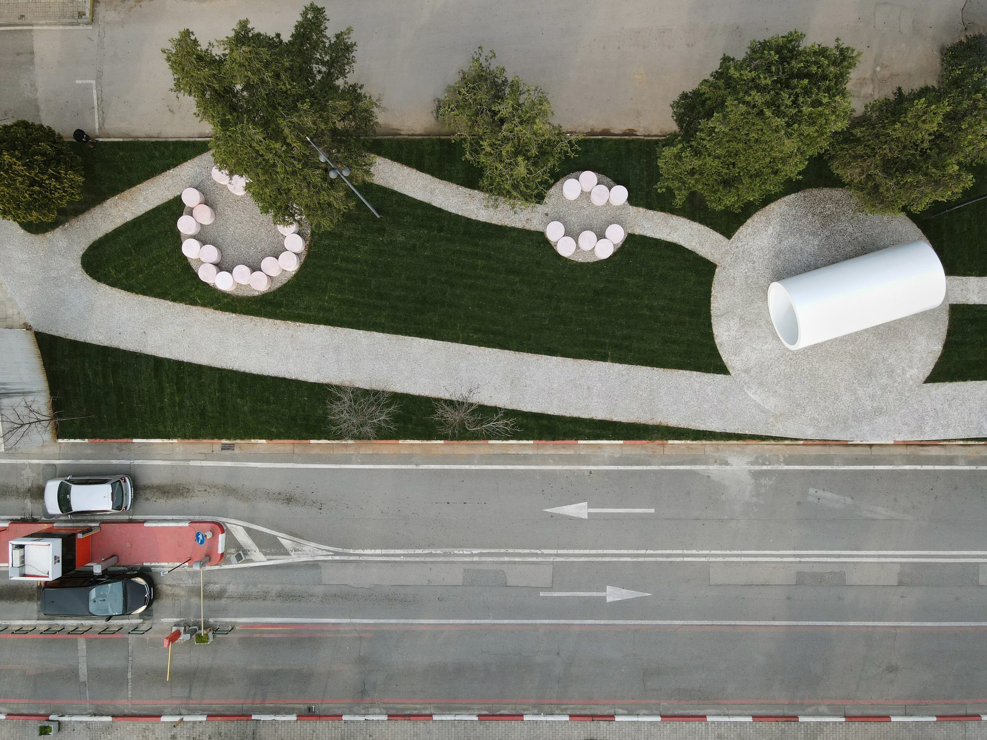 The landscape on which the artwork is placed presents itself as a playful group of circular shapes of varying sizes, spanning from the curved wall element, until the parking of the hospital to the south, like an archipelago in between a surface of natural grass. Through this strategy, the principal aim is to minimize the impact on the surrounding presence of nature, by not only preserving all of the trees, plants, and vegetation already present in the site; but also by adding to the surface of grass-covered space in this small urban environment.