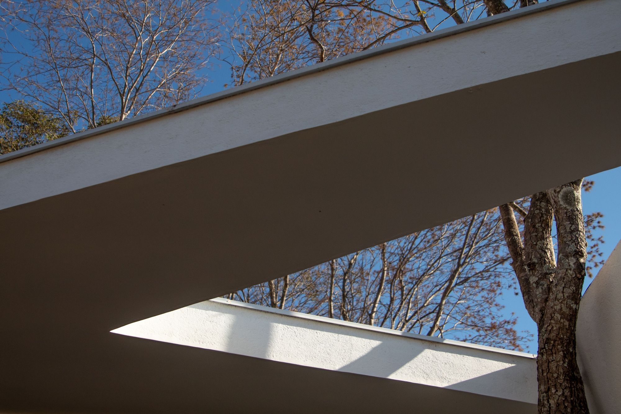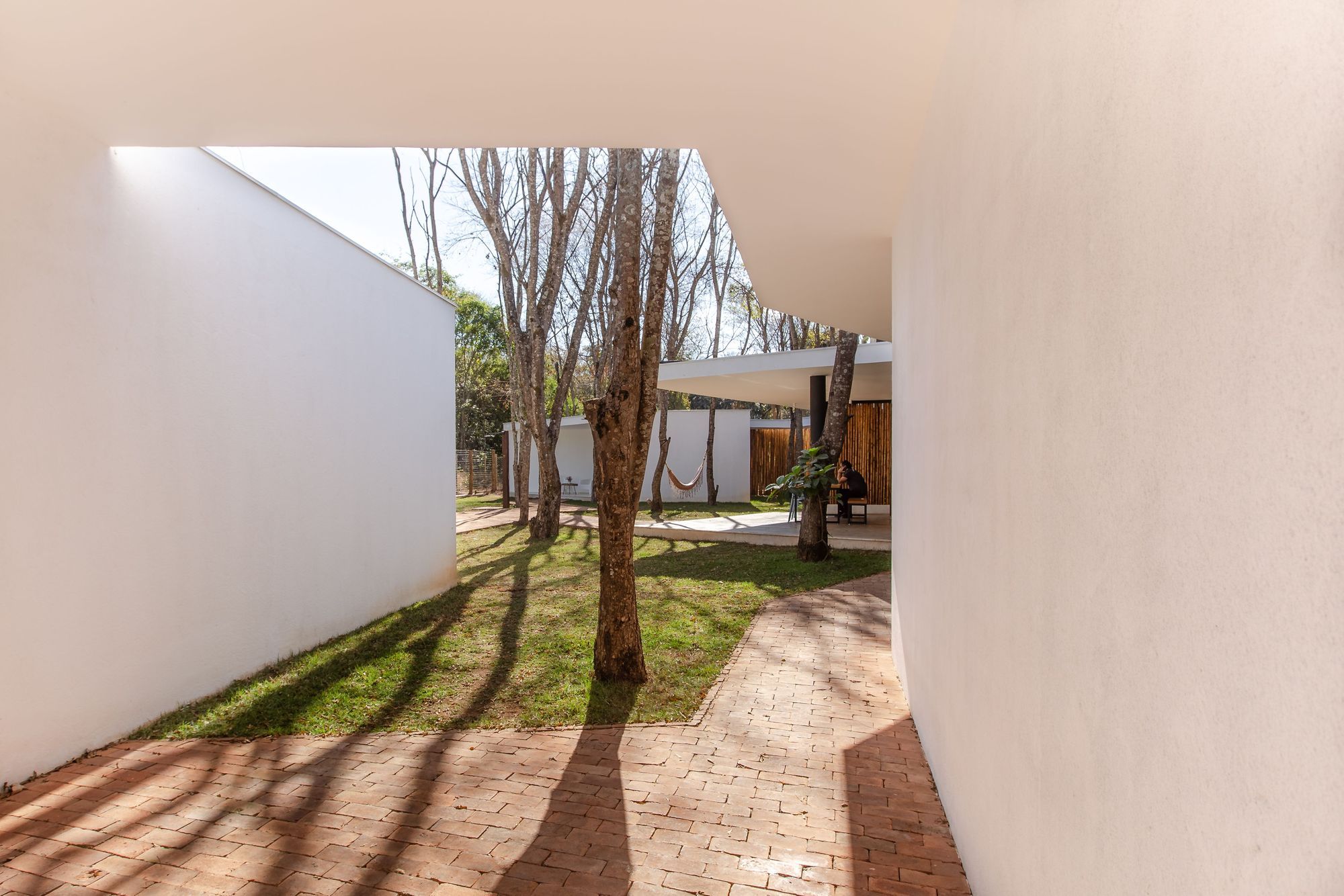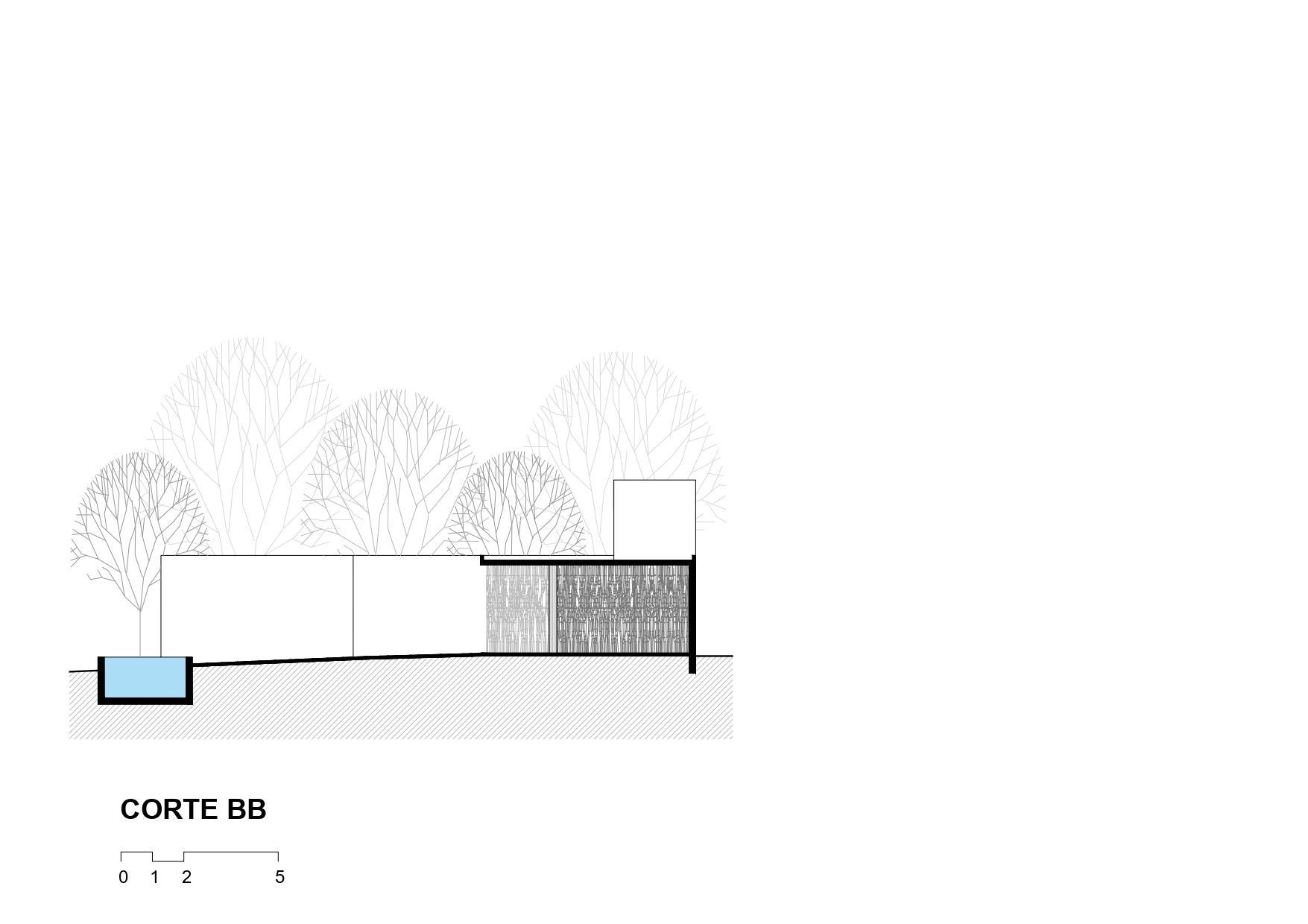 Its implementation strategy was created from questioning which parts of the land should not be occupied and what should be maintained, reversing the logic of thinking first in what to build. In order to maintain all the vegetation on the ground, the program was distributed under a fluid slab that unfolds through the empty spaces between the trees.