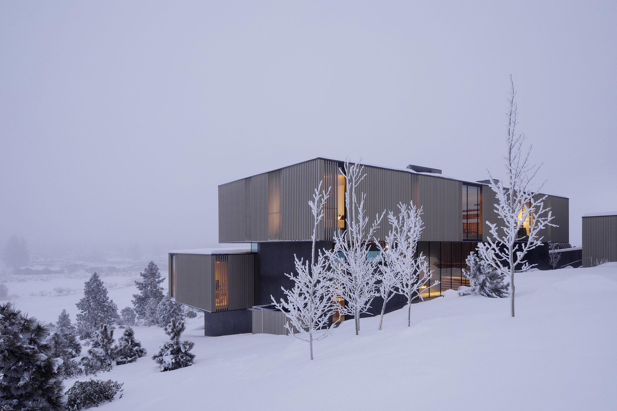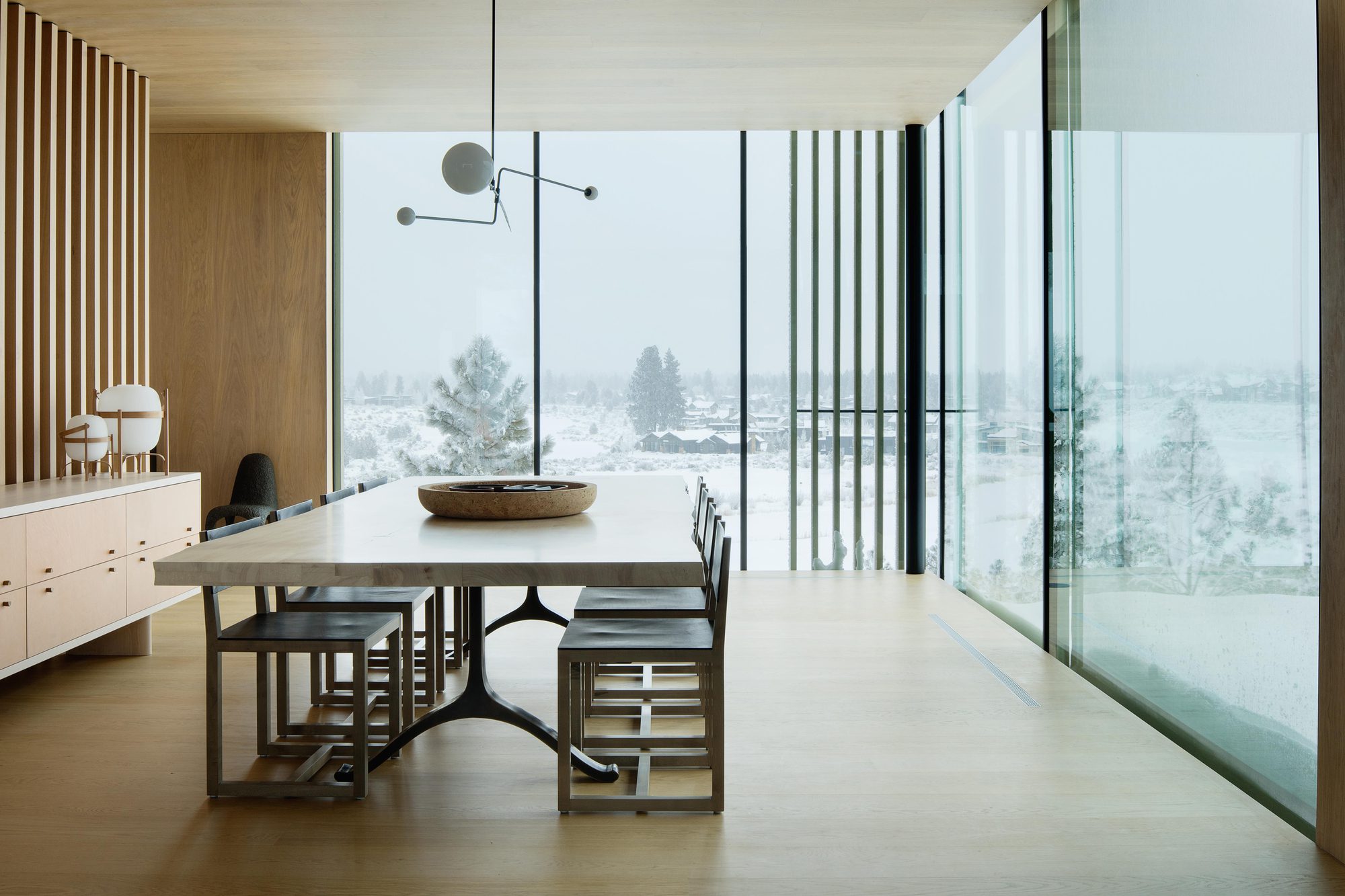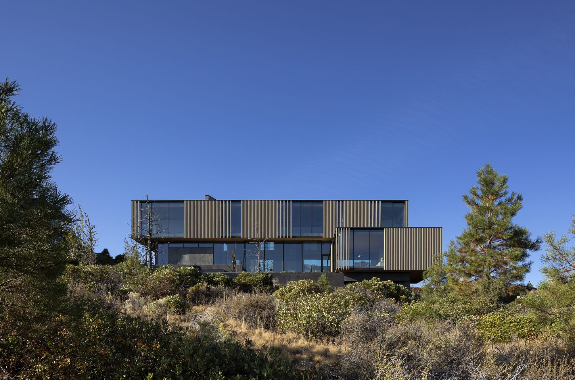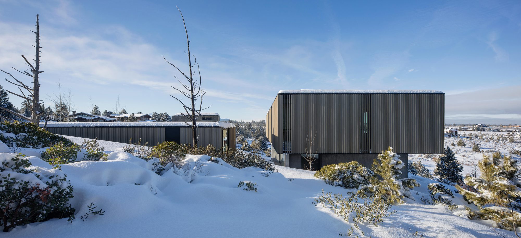 Inspired by weathering tree snags, the exterior of the rectangular volumes is clad in coarse wood slats, maintaining a consistent texture over windows and walls. The monolithic masses—faceted, carved, and chamfered—reinforce their connection to the nearby basalt and obsidian, resembling their eroding yet enduring forms. The design offers varying degrees of shelter from the intense desert sun and wind, allowing the high desert climate to permeate the house at all times of the year.