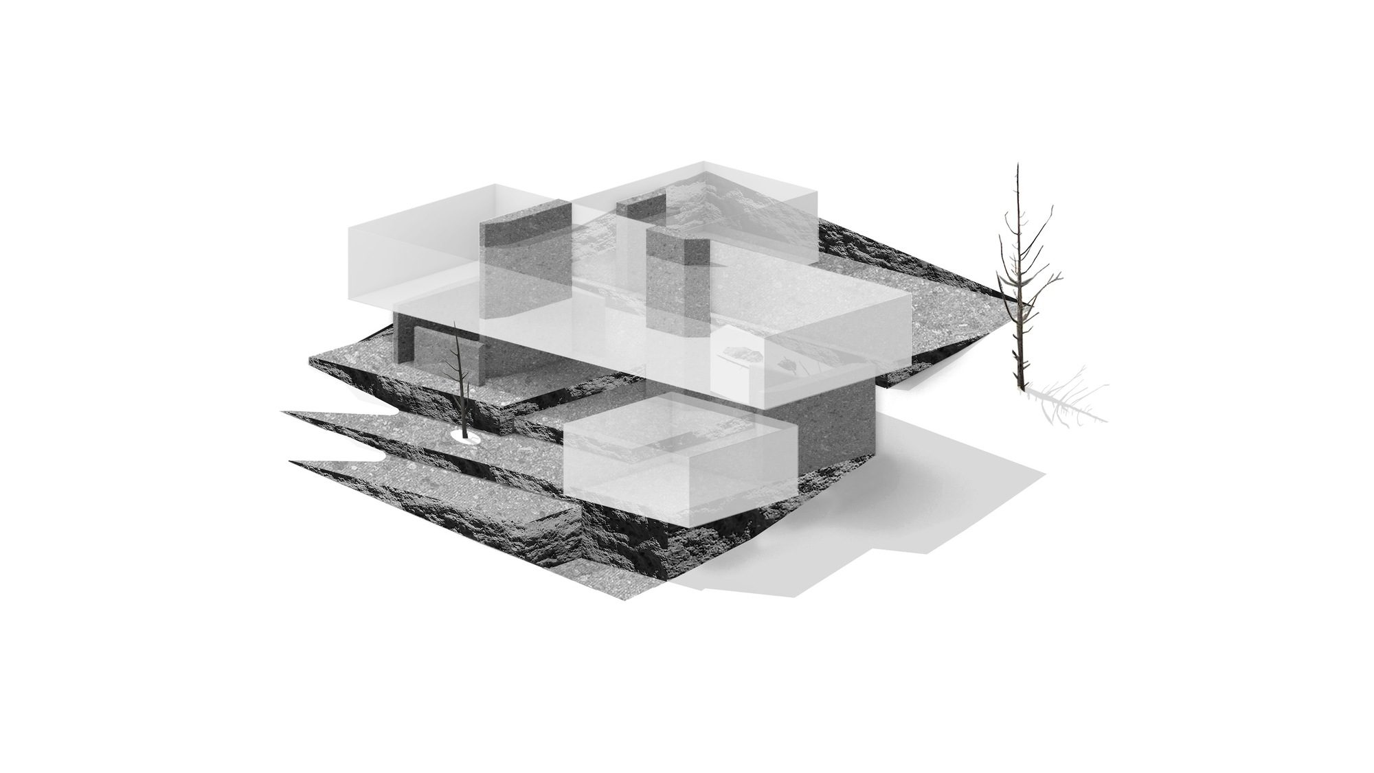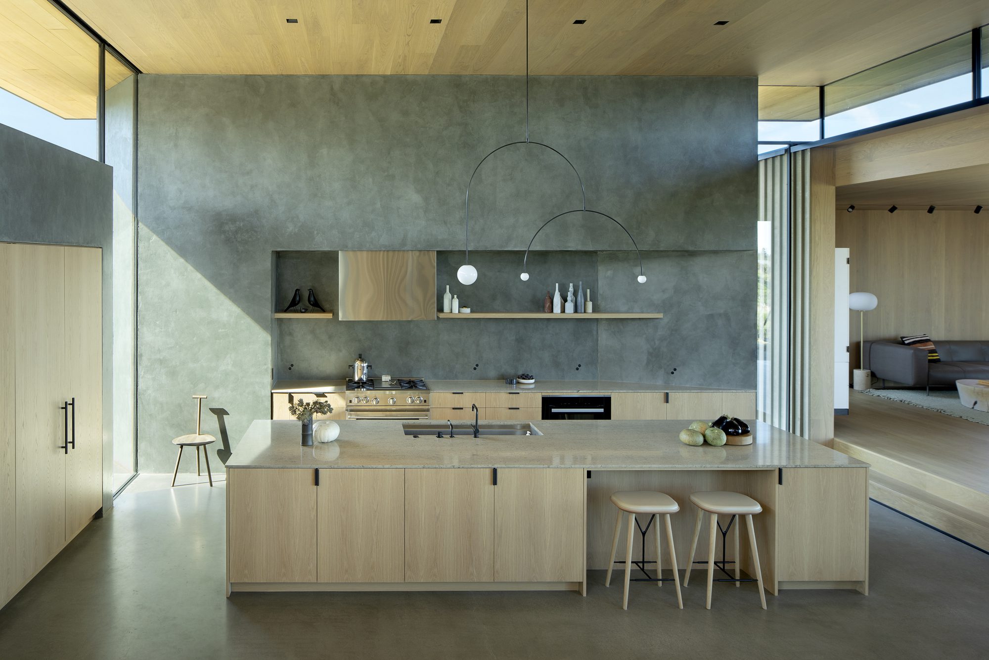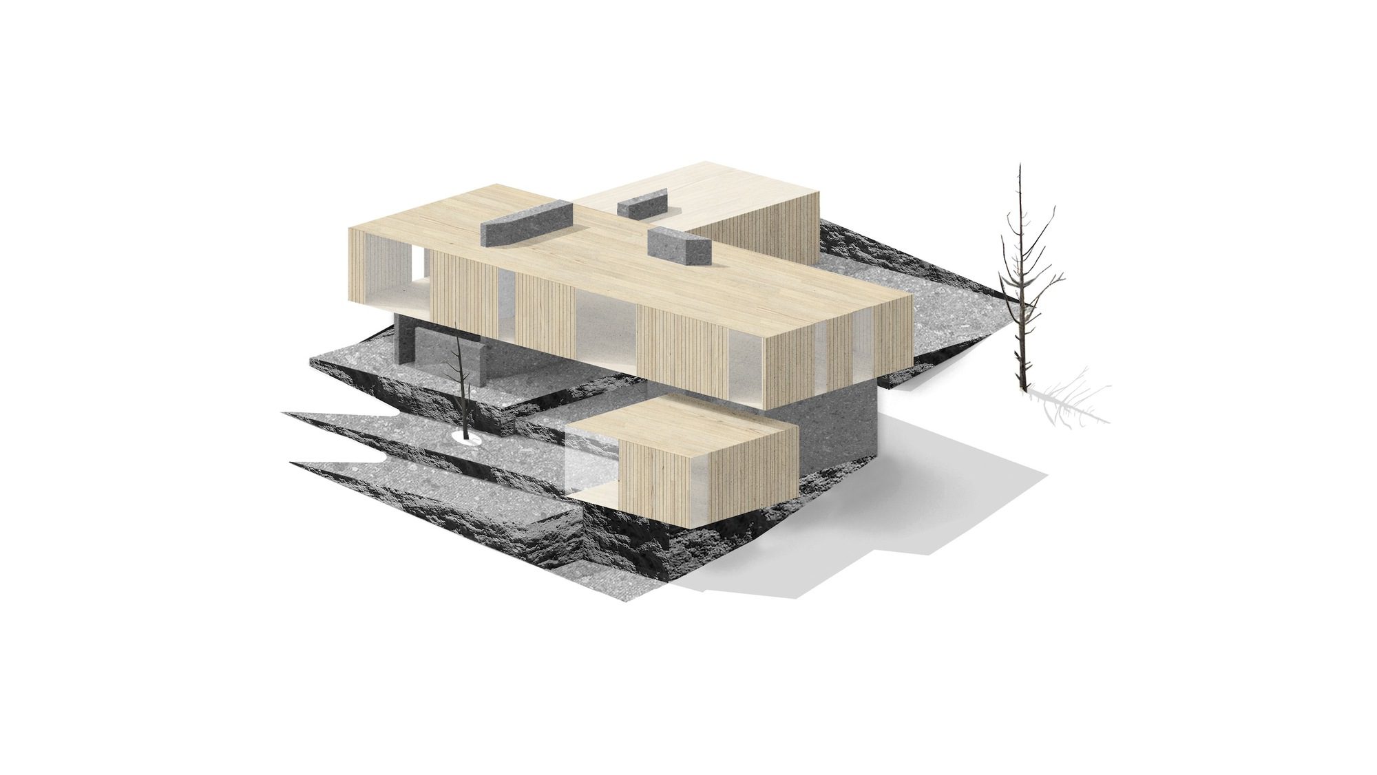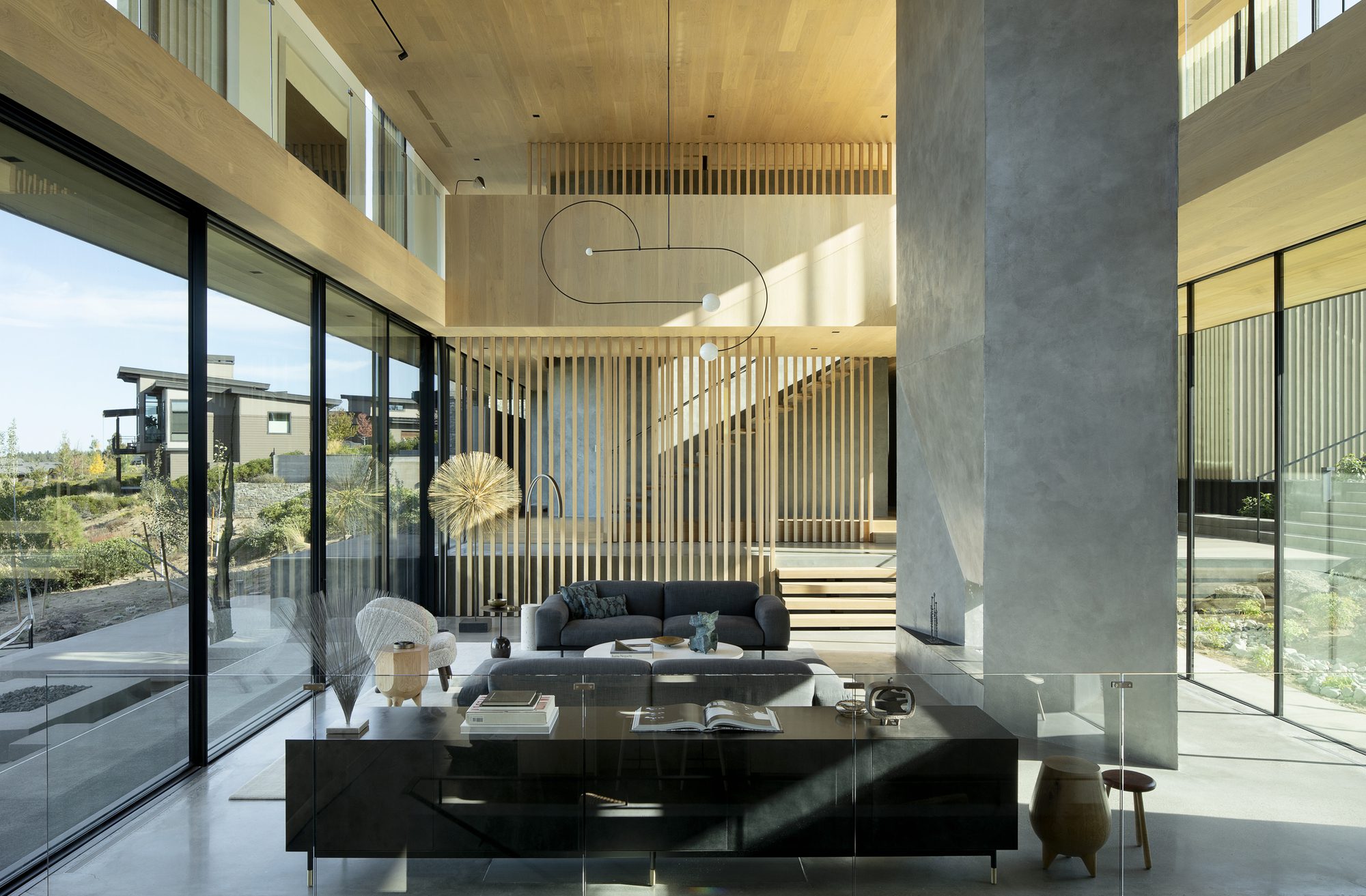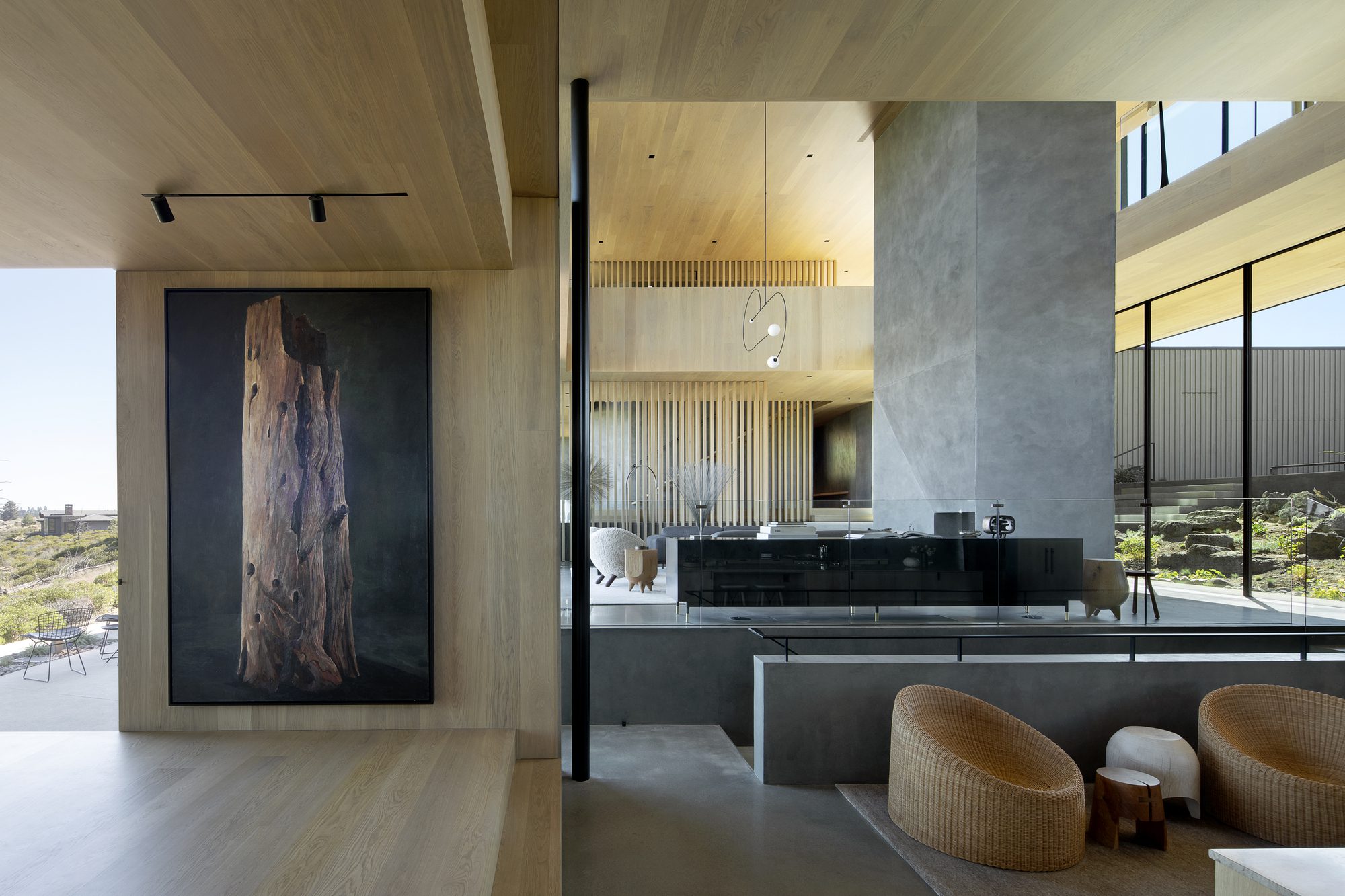 Inspired by weathering tree snags, the exterior of the rectangular volumes is clad in coarse wood slats, maintaining a consistent texture over windows and walls. The monolithic masses—faceted, carved, and chamfered—reinforce their connection to the nearby basalt and obsidian, resembling their eroding yet enduring forms. The design offers varying degrees of shelter from the intense desert sun and wind, allowing the high desert climate to permeate the house at all times of the year.