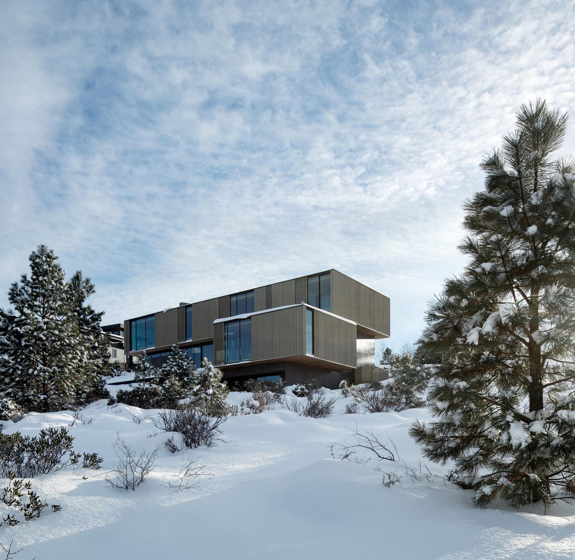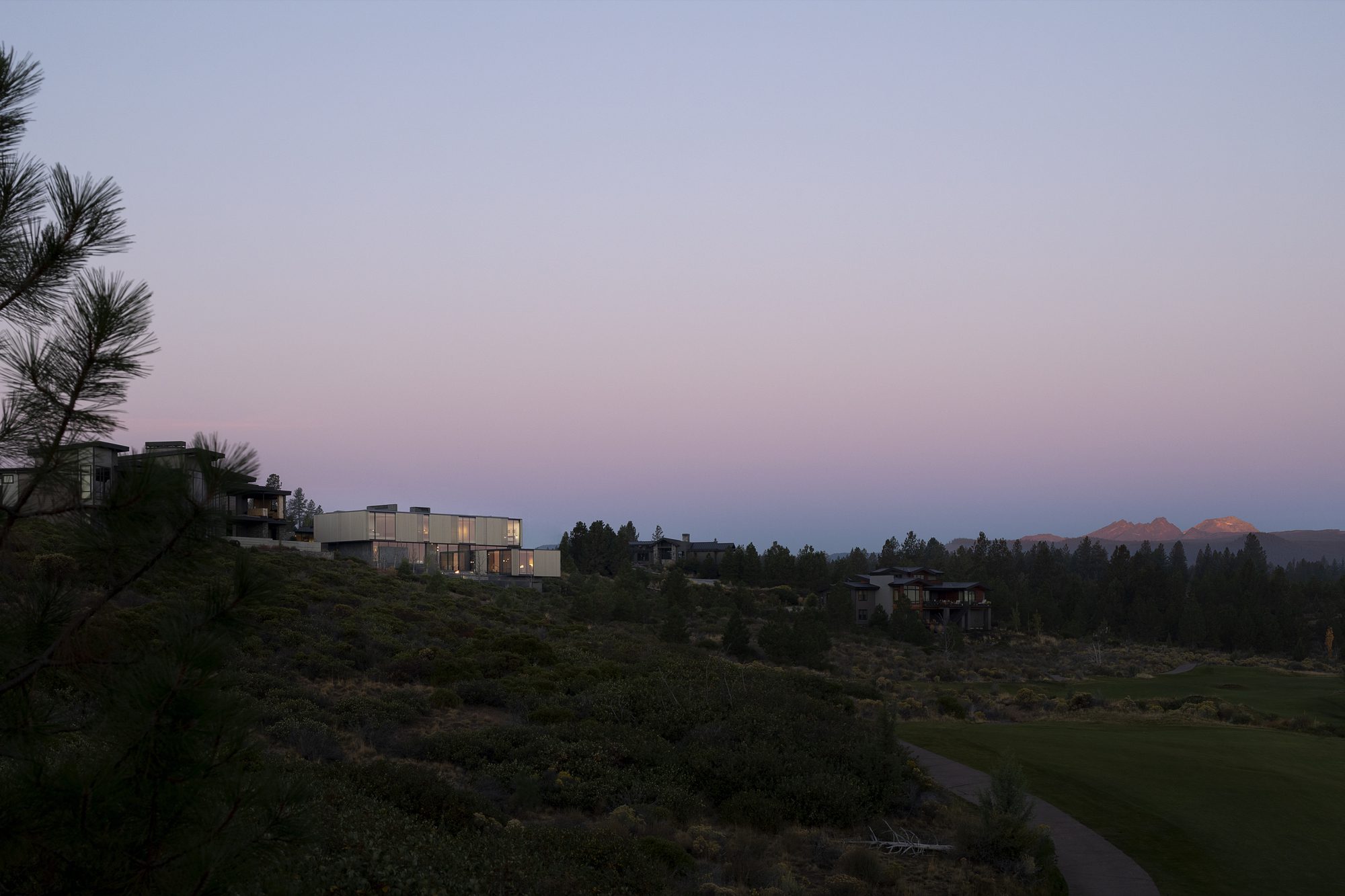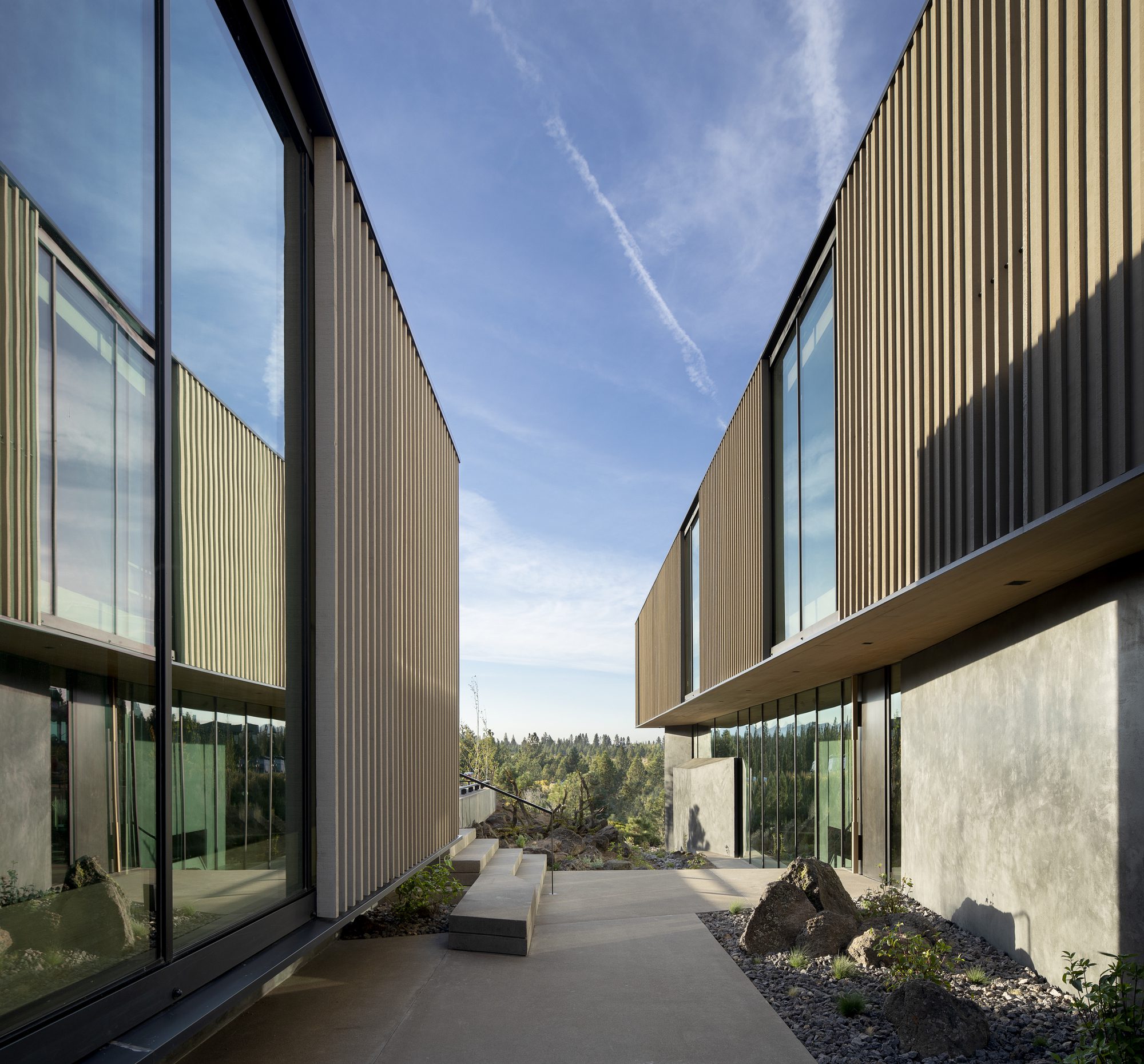 “Tetherow Overlook House” Located on a bluff, the 7,600-square-foot home nestles into the site and unfolds with a series of cascading platforms, revealing themselves as they descend the gentle, pumice-blanketed hillside. Faceted mass walls, inspired by nearby volcanic rock, anchor key spaces, guiding movement, defining boundaries, and directing views. Three distinct wood volumes house specific functions of the home: a garage and studio, bedrooms, and a dining area. When moving through the home, one experiences a mix of spaces, alternating between more open areas occurring between the masses and enclosed spaces within the volumes.