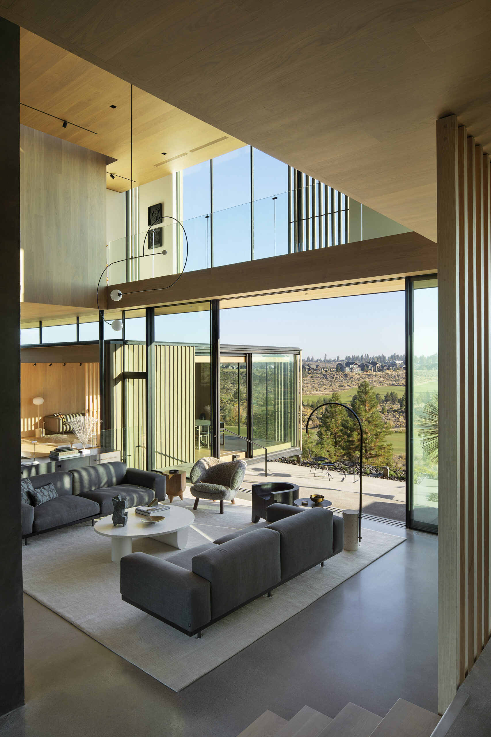 The design for this family home “Tetherow Overlook House” in Central Oregon’s high desert landscape balances a sophisticated spatial arrangement with a rich yet minimal material palette. The building form is a highly sculptural abstraction that engages in a dialogue with its surroundings. The residence seamlessly blends indoors and out, frames views near and far, and invokes the rich tones and textures of its context. The home complements the owners’ notable collection of conceptual modern art while accommodating their lifestyle centered around entertainment, family activities, and creative pursuits.