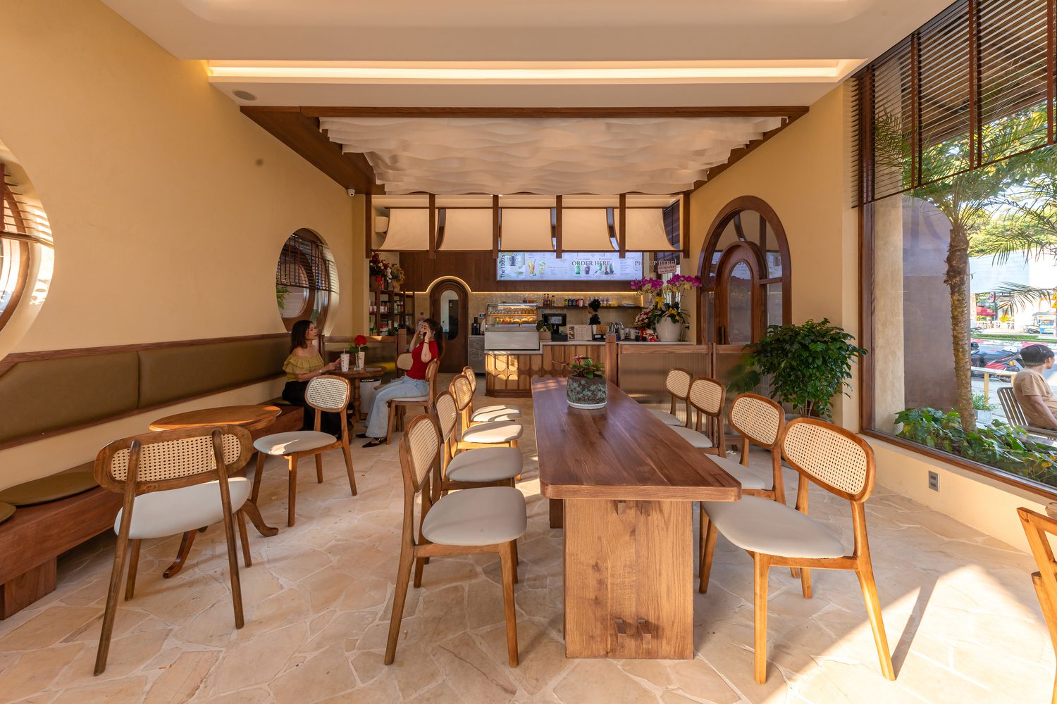 Complementing the lush greenery surrounding the structure, the design incorporates a palette of natural and traditional materials, including stone, baked brick, woven reed panels, natural wood, and rammed-earth textures. Each material is applied with care to preserve its raw character, creating a grounded yet contemporary atmosphere. This tactile approach ensures the café remains warm, approachable, and visually appealing to every visitor.
