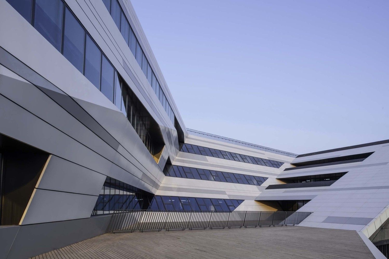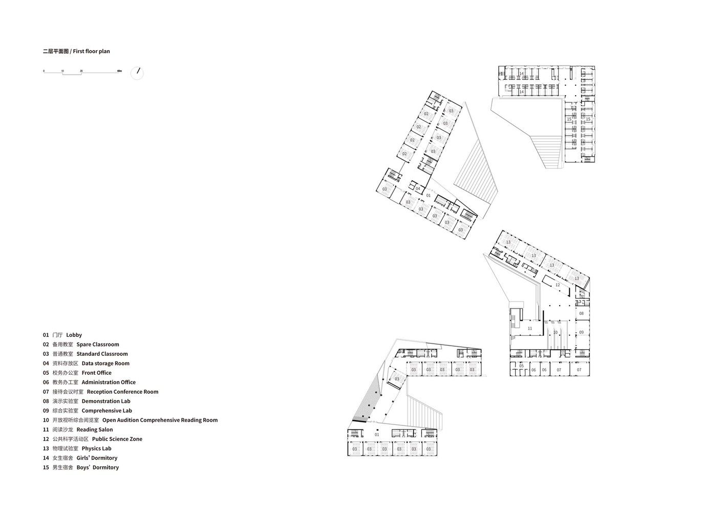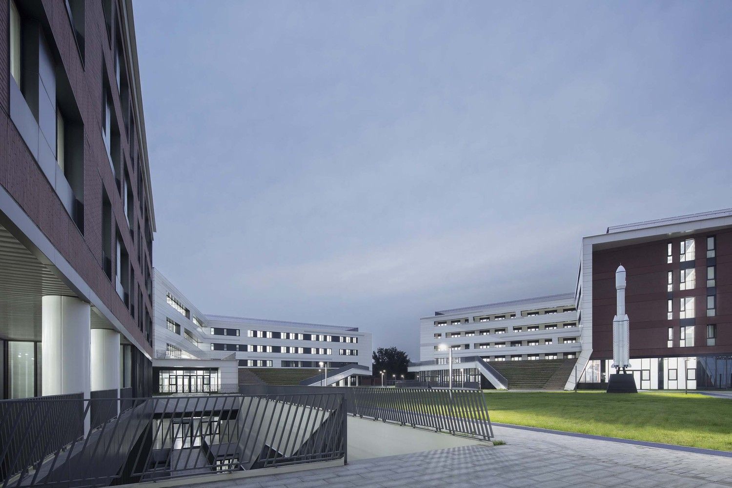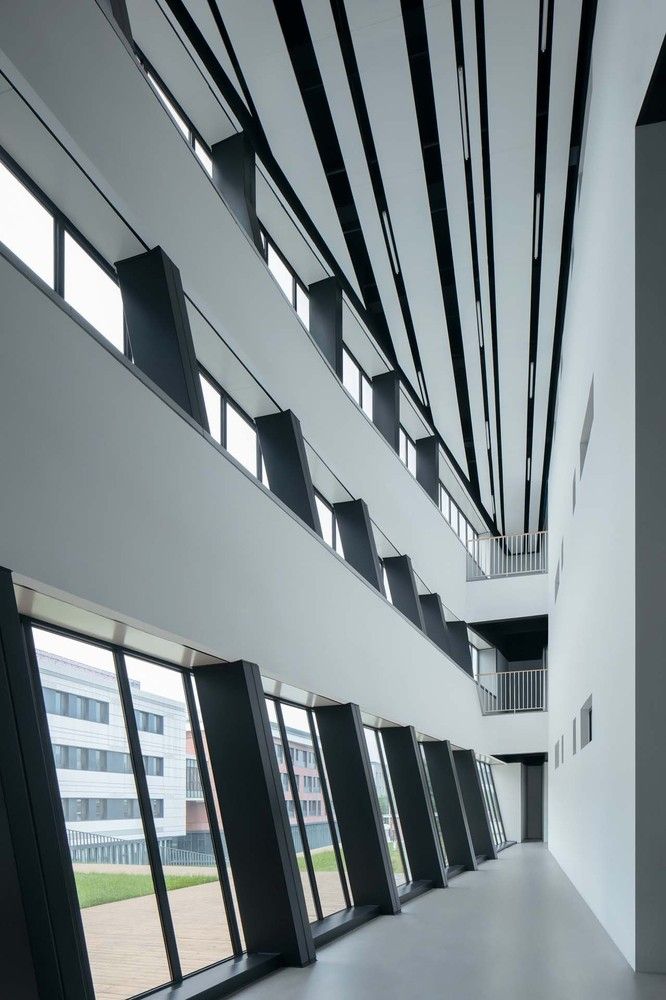 We try to express the two cultural themes of the campus — the High School affiliated with Renmin University of China (RDFZ) and Beijing Aerospace City — through “architectural language”: the building is made of red bricks and white aluminum plate, and the red bricks symbolize the inheritance of RDFZ, while the white aluminum folding plate symbolizes the development of aerospace science and technology.