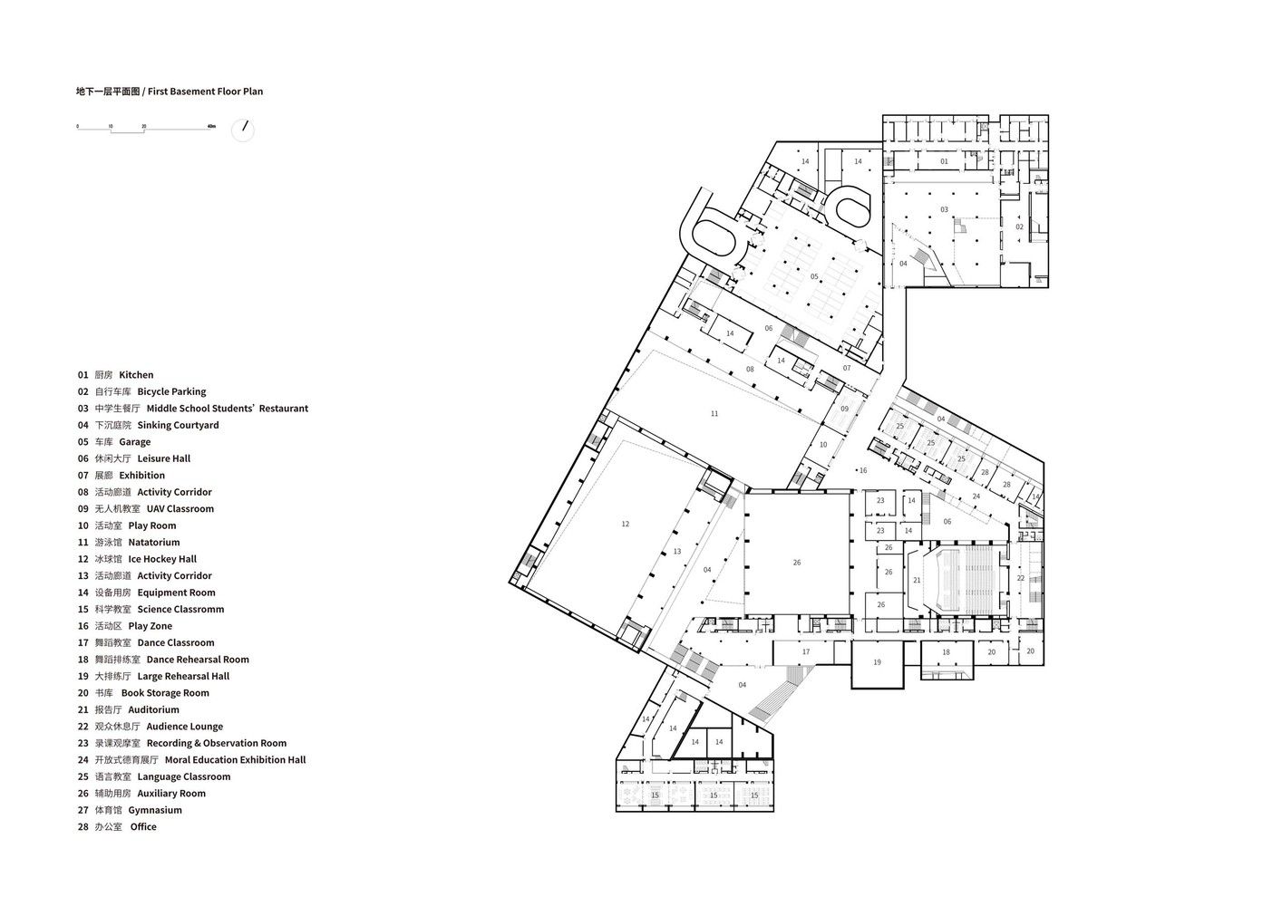 The large venues without mandatory demand for sunshine are set underground, solving their problems of ventilation and fire control by sinking the courtyard. So that the large venues can be available to the community without disturbing the buildings above ground.