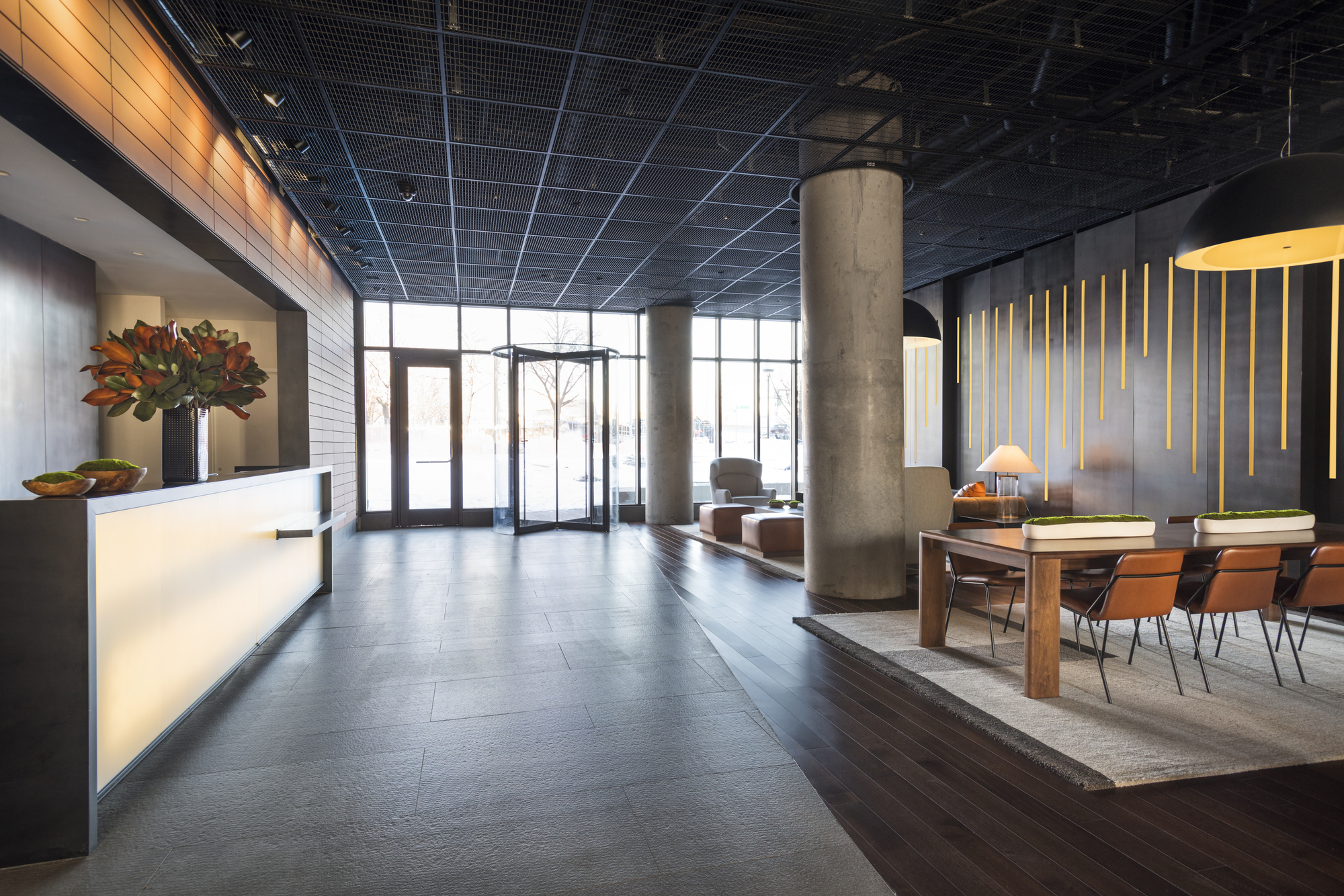 Rather than keeping the valuable high floors for private penthouses, as is common practice, the client and design team decided to create community spaces at the top of the building. An expansive lounge and dramatic terrace on the 33rd floor, The Overlook, is available for all tenants to enjoy. A second residents’ lounge is on the ninth floor. Access to the building is either via a dedicated drop-off on the north side of the building, leading directly to the underground parking, or via a lush public plaza on the south side.